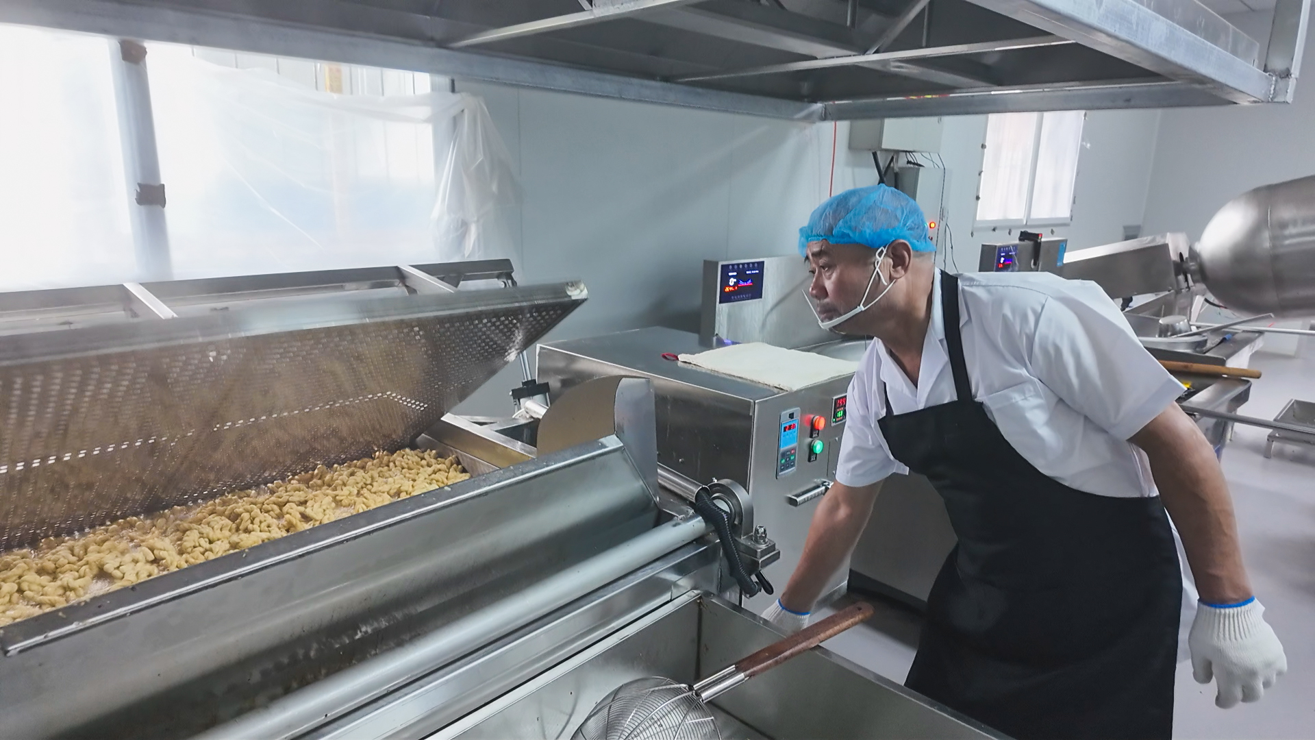 在生产线前端,几名经过专业培训的工人正有条不紊地处理面团:雪白的面团在手中反复揉搓,直至变得筋道十足,随后被送入成型设备,转眼化作一根根粗细均匀的麻花坯;坯体顺着传送带进入恒温油炸锅,金黄的油花不断翻滚,原本雪白的麻花坯渐渐染上诱人的焦糖色,伴随着“滋滋”的声响,油脂与面粉的香气愈发醇厚;炸制完成后,麻花被送入冷却区,褪去热气后便进入包装环节,工人麻利地将其分装成袋,贴上标签,一箱箱待发的麻花很快在车间角落堆成小山。