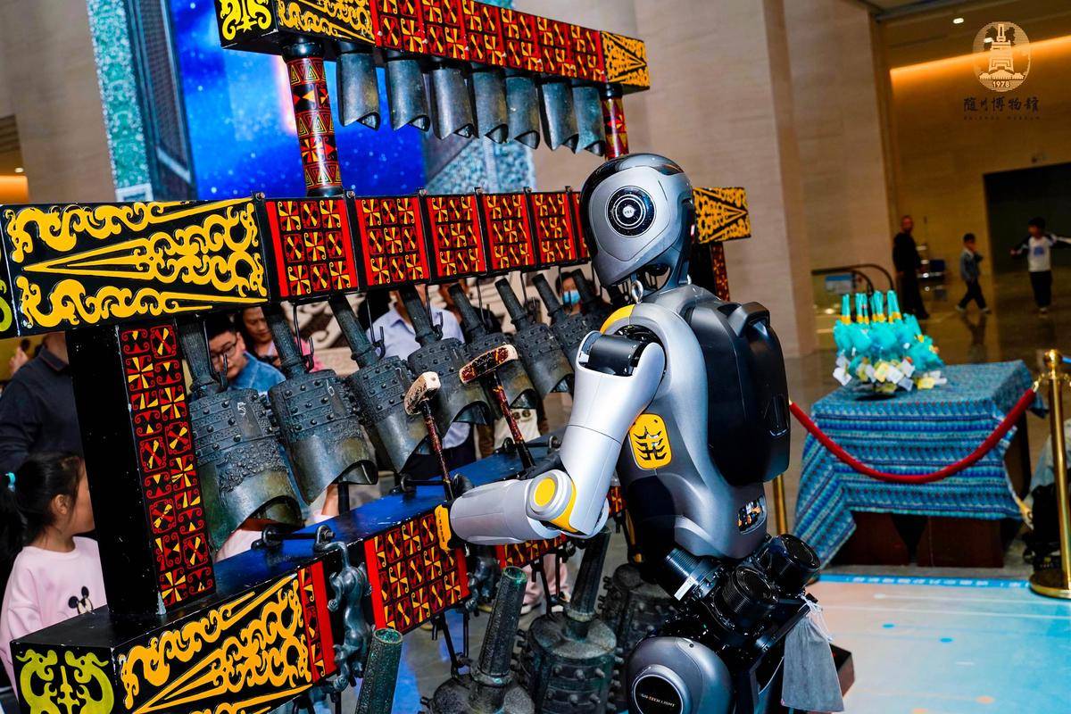 在随州博物馆,曾侯乙编钟与人形机器人跨界合奏。(湖北日报全媒记者 易雯 摄)