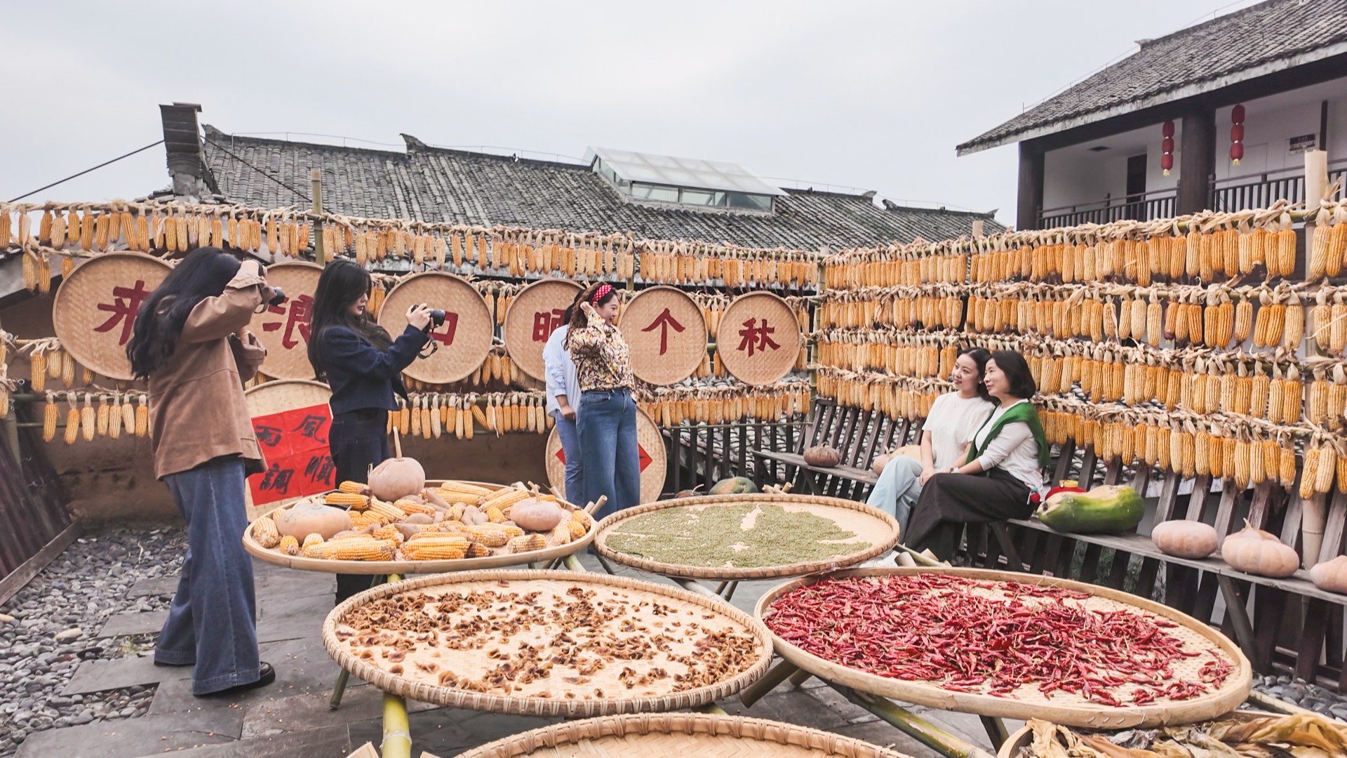 10月15日,走进该度假区喜悦酒店,庭院角落的晒秋景致格外惹眼:木质晒盘层层叠叠,搭起错落有致的“观景台”,金灿灿的玉米、红彤彤的辣椒、黄澄澄的南瓜整齐摆放,一幅生动的秋收图景跃然眼前。几位游客正举着手机,俯身、侧首,精心寻找最佳角度,将这份浓郁的秋意收入镜头。