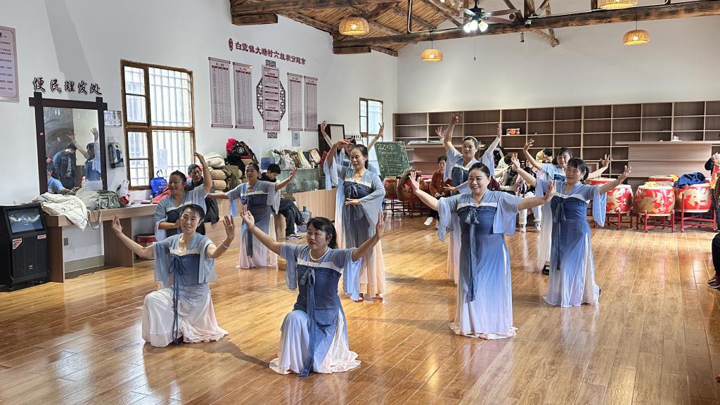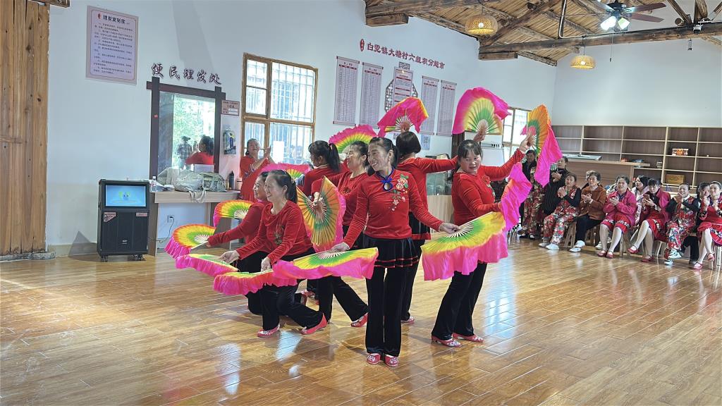 村老年学校的学员们纷纷登台,《黄梅悠悠》《童年老家》等舞蹈精彩上演,舞步轻盈、精神饱满。锣鼓表演《我祝祖国三杯酒》鼓点激昂、节奏铿锵,不仅展现出大塘村民积极向上的精气神,更抒发了对祖国母亲的美好祝愿,为汇演画上圆满句号。