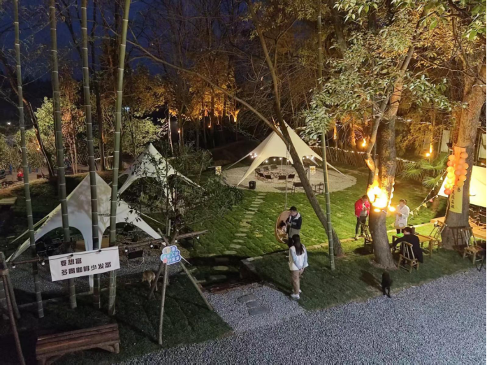 藏于山野的治愈系露营地,大小帐篷星罗棋布,组成野趣十足的露营区;开阔平整的草坪与充满田园风情的装饰,构成了惬意的公共休闲空间。