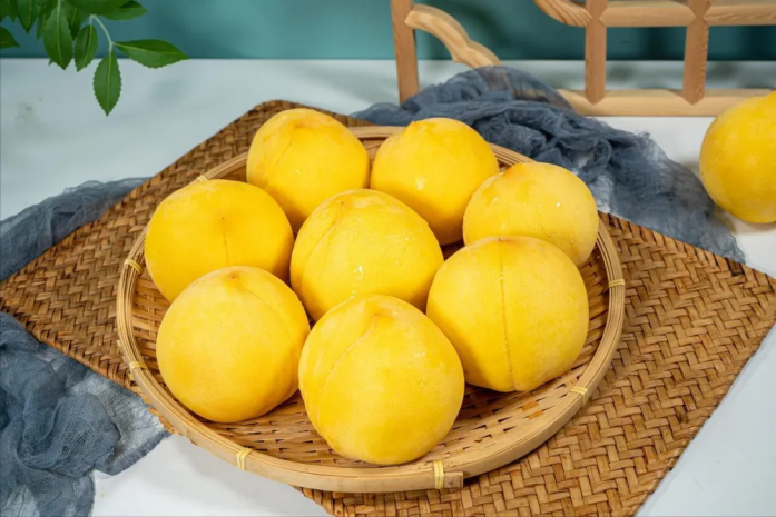 每一颗黄桃都拥有饱满圆润的身姿,果皮金黄,向阳面透着一抹绯红,仿佛将落日的余晖也锁进了果肉里。