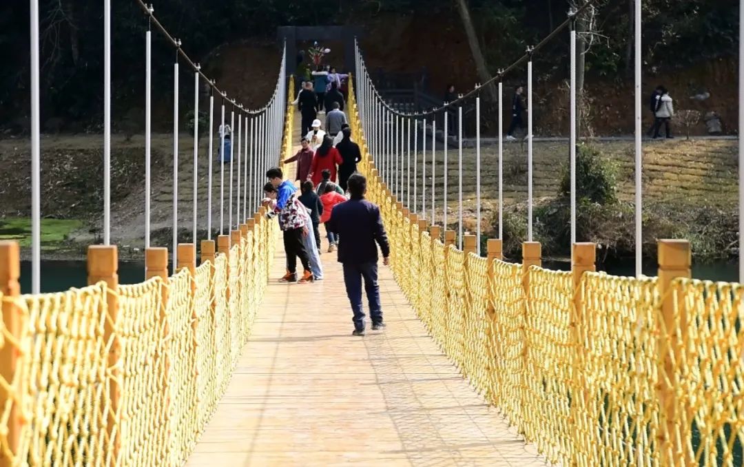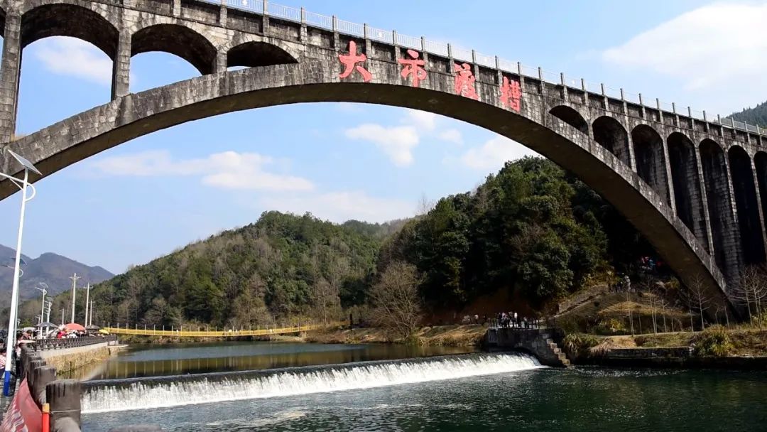 初春的白霓镇大市渡槽,流水潺潺,不少游客跨过吊桥,爬上渡槽,一睹大市村的美丽春景。