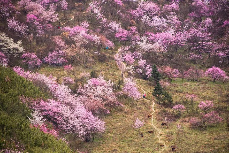 金庸笔下有一座令人神往的桃花岛,虽然不知道它究竟是什么模样,但想来“康丰源生态旅游区桃林“与之相比应该也是毫不逊色的。一到花开时,站在远处望去,满山遍野的粉红色在春风里肆意蔓延。
