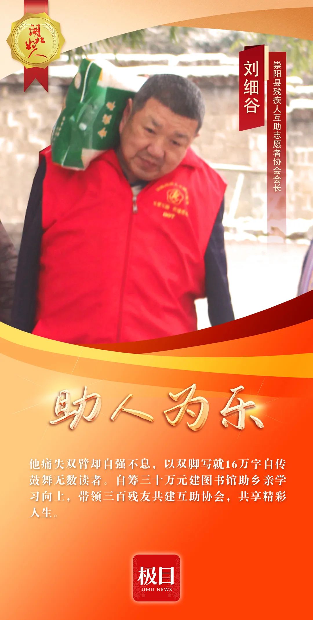 今天,湖北省文明办发布2023年第二季度“湖北好人”名单。据了解,此次名单中共有10人(组)上榜。崇阳县残疾人互助志愿者协会会长刘细谷榜上有名。