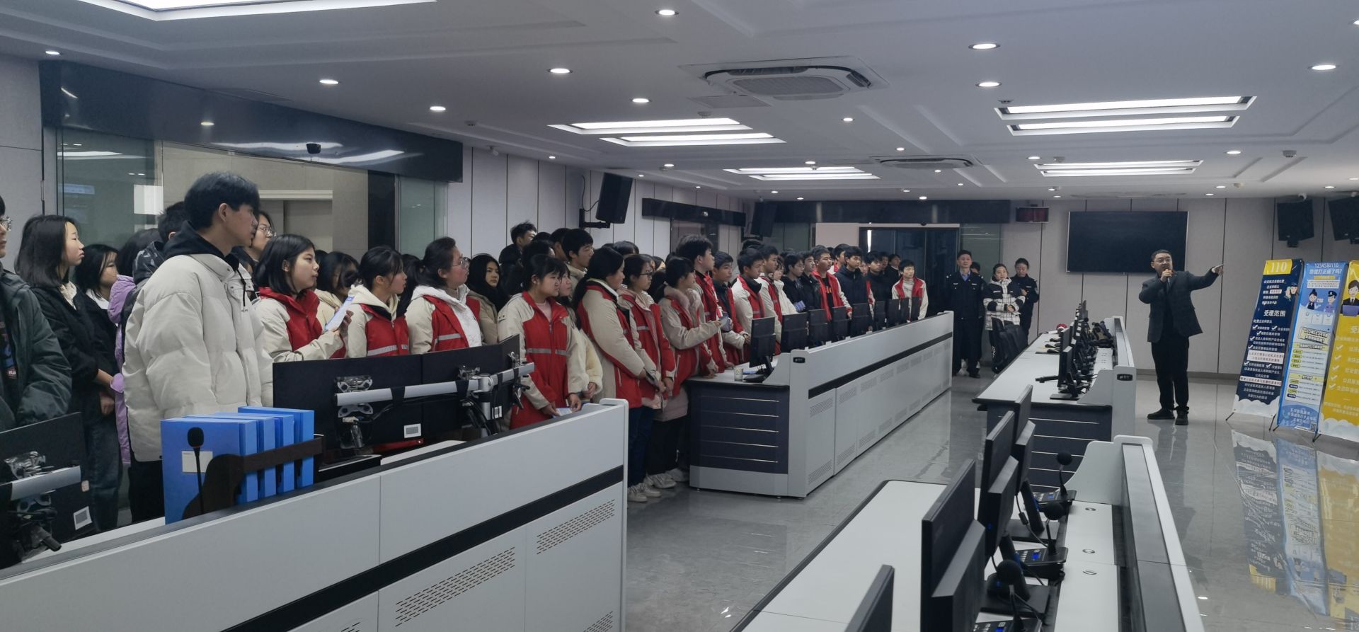 在县公安局指挥中心,讲解员向参与活动的学生们提出关于“中国人民警察节”的相关问题,同时就110基本知识、110受理范围等进行互动,同学们踊跃举手回答,现场氛围热烈。
