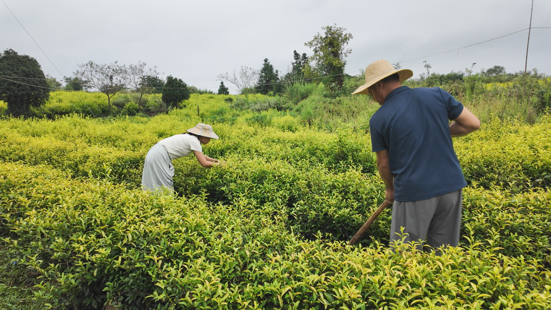 9月9日,在崇阳县沙坪镇黄茆村千亩生态茶园,茶园负责人盛华东正带领茶农穿梭在茶树间,清除根部杂草,修剪过密枝条与老化枝丫,保障茶树的营养供给,保留充足的通风透光空间。