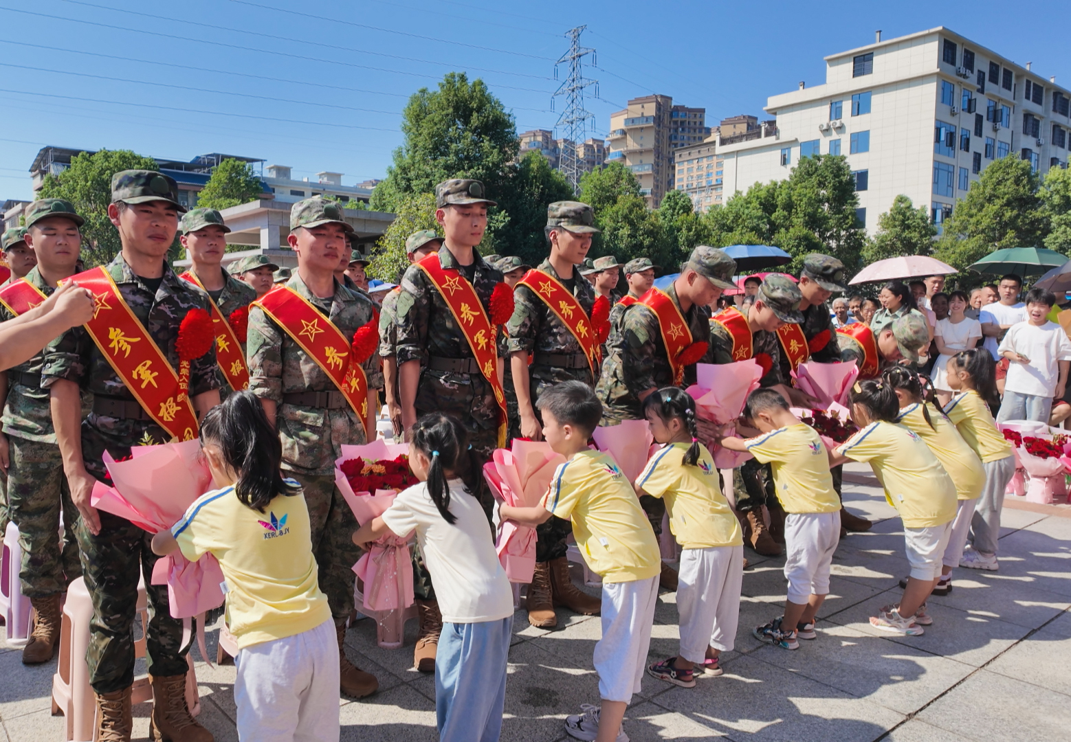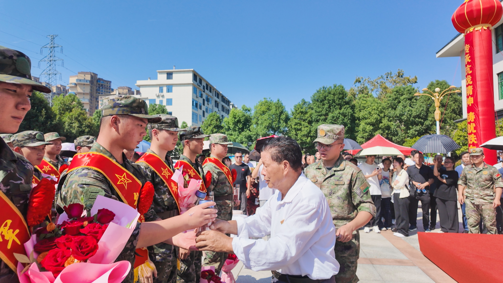 活动中,县老年书法家协会为新兵赠送抗战精神主题书法作品,全省拥军模范张日平为新兵送上纪念水杯,幼儿园学生给新兵献花,以实际行动传递拥军爱军情怀。