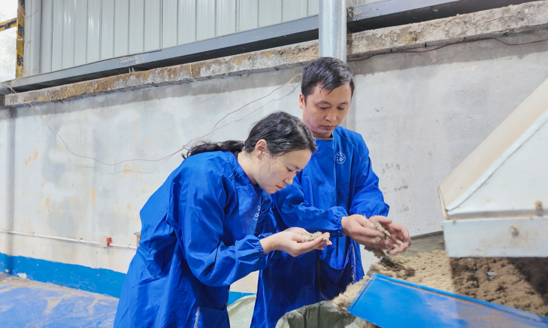 晒干的艾草经过设备加工后,筛选出不同粗细的艾绒,并通过分层筛网落入对应料仓:颗粒较粗的艾绒将用于制作香薰和饲料,颗粒适中的加工成艾草枕头。