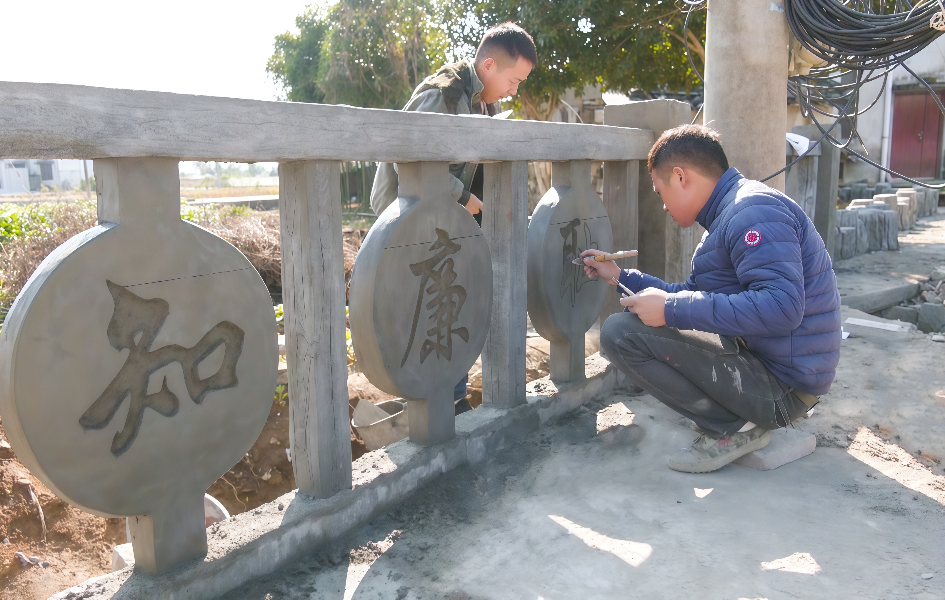 与此同时,八一村的建设现场同样干劲十足。工匠们在青砖景墙上精心镌刻标语,另一边,施工队正加紧修砌排水沟,全方位提升村庄“韧性”。
