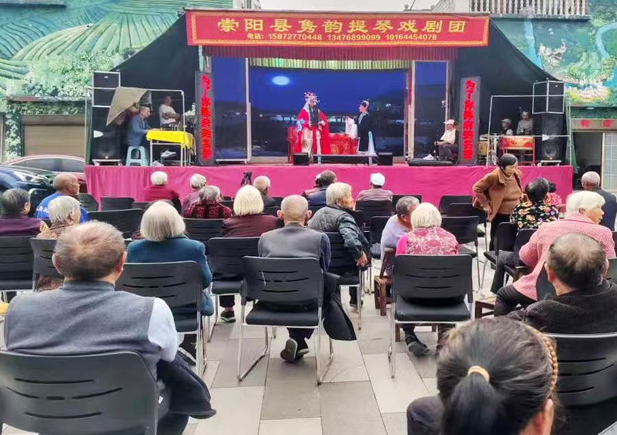 下午,崇阳“提琴戏”的演员们身着精致戏服,凭借精湛的唱腔和生动的表演,将传统戏曲的魅力展现得淋漓尽致,台下游客听得津津有味,不时响起阵阵掌声。与此同时,工作人员还为游客们送上了麻花、黄精茶等,大家一边欣赏着悠扬的戏曲,一边品尝着地道的美味,尽情体验悠闲自在的田园生活。
