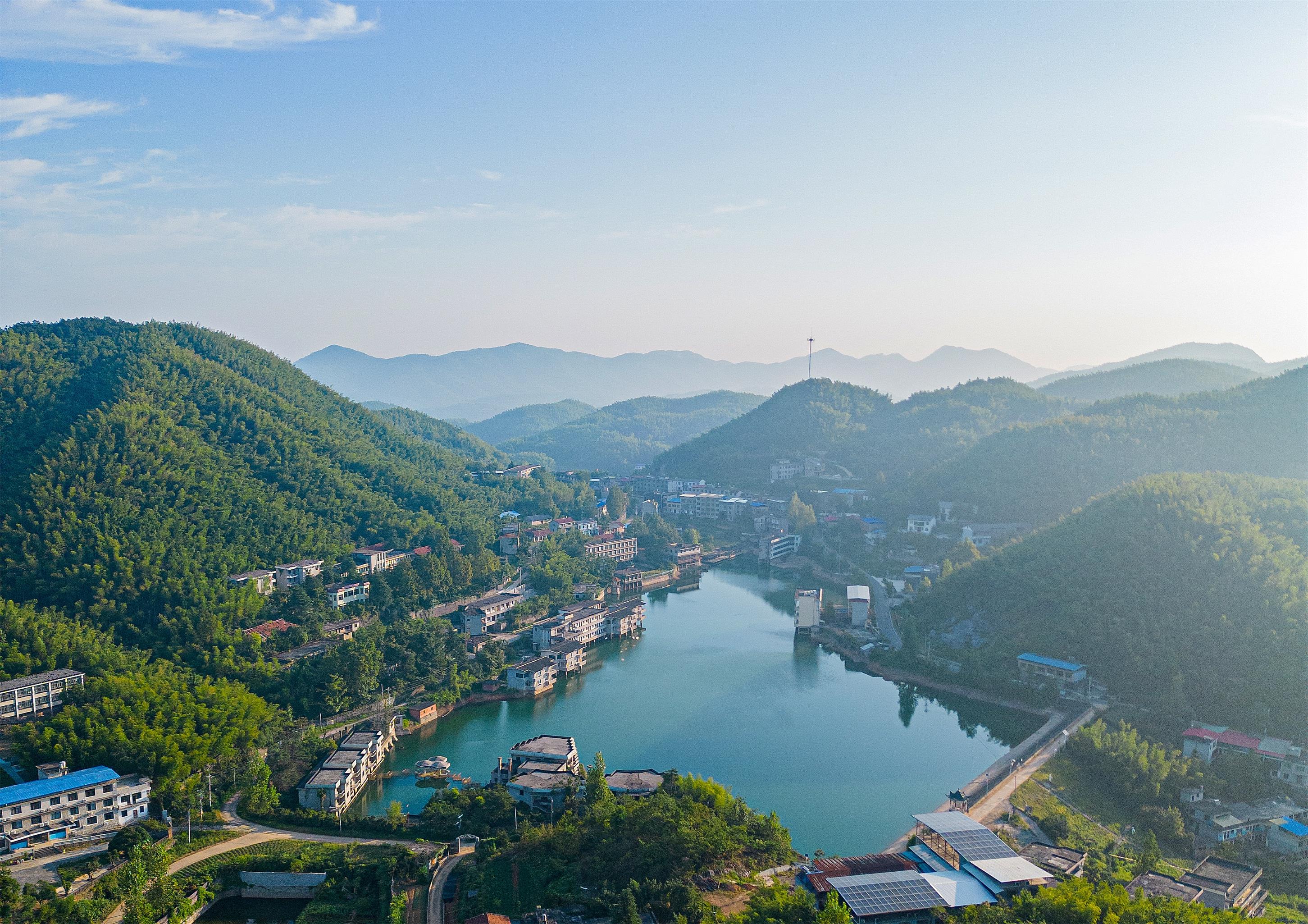 南望,景致骤然变得雄浑起来。路口、港口、金塘、高枧这些地方,仿佛带着金属的质感,它们坐落在山峦的环抱之中,像是嵌在巨人铠甲上的几颗铆钉,沉稳而坚毅。而真正主宰这片天地的,是那巍巍然的幕阜山脉。它并非孤峰独秀,而是千峰叠翠,万岭连绵,如一道巨大的、青黛色的屏风,接天连地,横亘在视野的尽头。秋色在这里表现得最为慷慨淋漓,它不再是小心翼翼地点染,而是纵情地泼洒。看那山色,层次何其丰富:近处的,是深黛,是墨绿,沉着如哲人的思绪;稍远的,是赭黄,是熟褐,厚重如历史的沉淀;而最远的天际线那边,峰峦的尖顶在逆光中呈现出一种近乎梦幻的、蓝紫色的剪影,与浮云缠绕,仿佛直接融入了天空。这连绵的山脉,像一群沉默的远古巨人,拱卫着这片土地,它们见证过多少风云变幻,却依旧默然无语,只在秋阳的斜照下,袒露着它们永恒的、苍劲的脊梁。南面的风光,是一曲用巨石和松风谱写的、沉雄壮阔的交响乐。