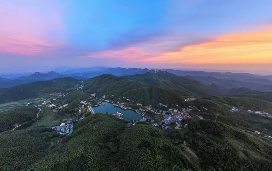 西望则是另一番亲切可人的景象。这里是崇阳的腹地,目光可以温柔地滑过舒缓的丘陵,像抚摸一片巨大的天鹅绒。田垄阡陌,划出规整而优美的几何图形,一些晚熟的作物还在田里泛着最后的金黄。白色的村舍如同珍珠,三三两两地散落在这片黄绿交织的锦缎上,屋顶上飘起的袅袅炊烟,是这静美图画中唯一流动的笔触,带着人间的温度与气息。更远处,崇阳县城的轮廓在淡淡的秋霭中显现,那些鳞次栉比的楼房,在日光下反射着点点白光,像一座微缩的模型,安静而祥和。那里是尘世的中心,是熙攘与故事的所在。但在此刻,从这高山之巅看下去,所有的喧嚣都被距离过滤了,只剩下一种井然有序的宁静美。一条公路如银色的丝带,在田野与山峦间婉转穿梭,偶尔有车辆驶过,也听不见声音,只像小小的甲虫在缓缓移动,为这片静穆的土地增添了些许生动的意趣。西面的画卷,是一首用稻谷、炊烟和田园写就的、充满人间暖意的抒情诗。