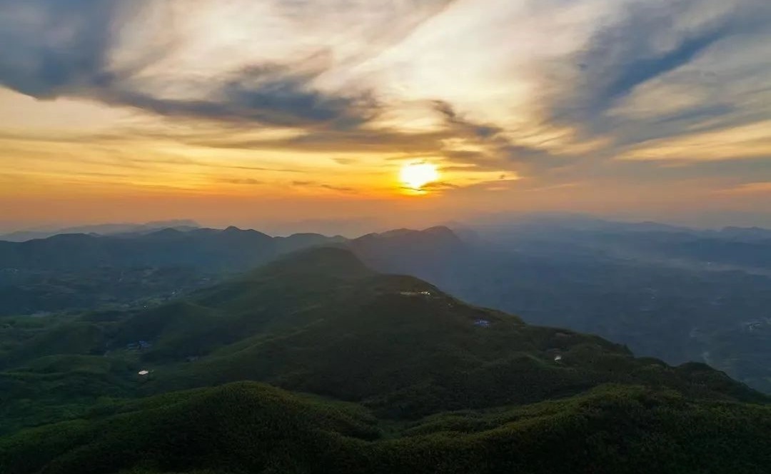 夕阳,终于开始向着西边的群山之后沉坠;光景的变化是迅疾而瑰丽的。起初,整片金沙岭像是被点燃了,那金色变得愈发浓烈,浓烈得近乎有些悲壮。每一道山脊,都成了一条条流淌着的火焰的河。天空的颜色也丰富起来,靠近落日的地方,是桔红、金黄的;向上,便渐渐过渡为紫蓝,最后融化在头顶那片幽深的孔雀蓝里。有归巢的鸟雀,成群的,像一些泼洒出去的墨点,鸣叫着飞过这巨大的、彩色的天幕。