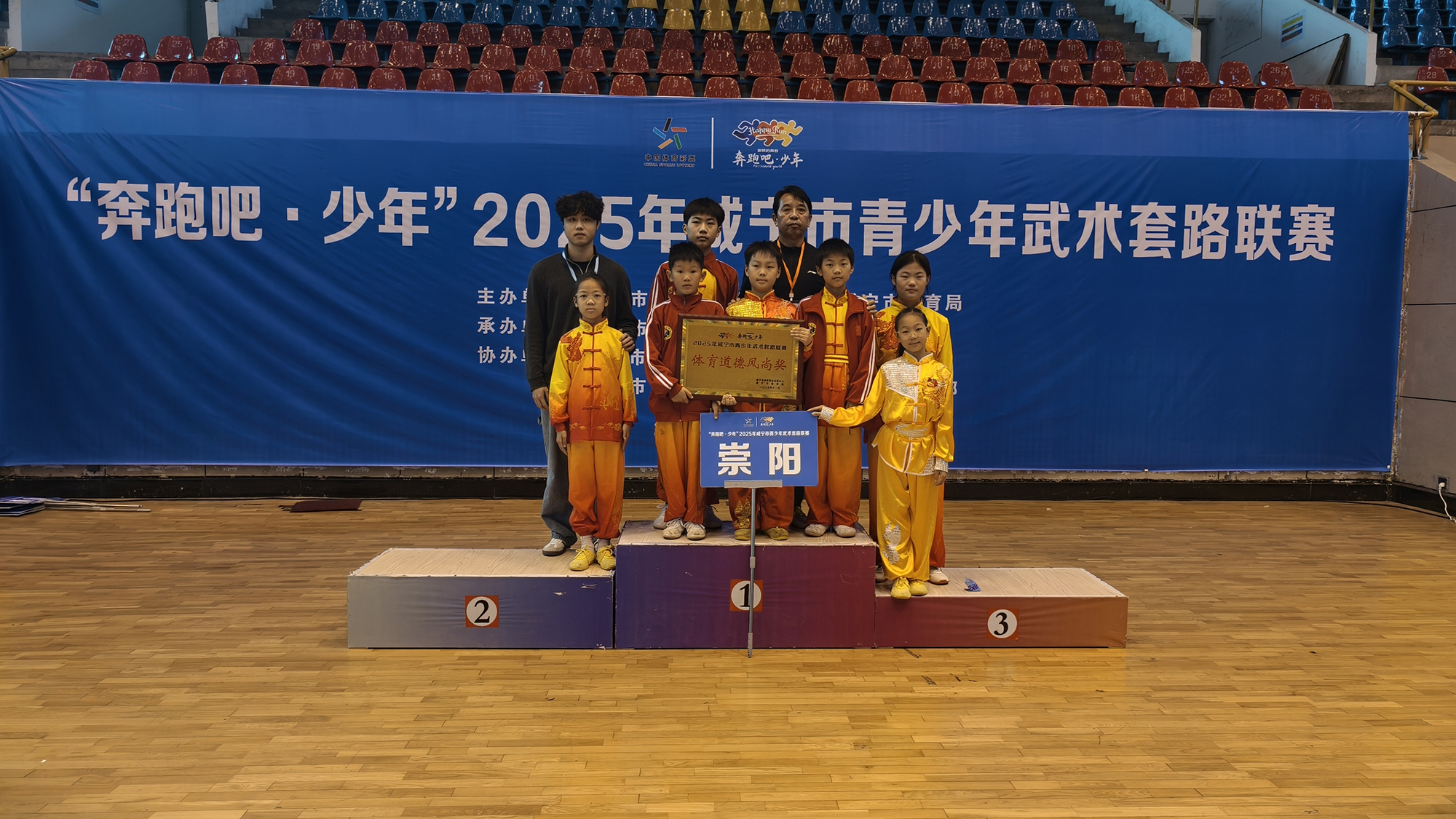 11月16日,2025年咸宁市青少年武术套路联赛在赤壁市落幕,崇阳县代表队携省级非遗“崇阳字门矮桩拳”惊艳亮相,19名参赛小将凭借原汁原味的地方传统武术拳械套路,斩获1金3银6铜,崇阳代表队获评“体育道德风尚奖”,教练汪勇荣获“优秀教练员”称号。