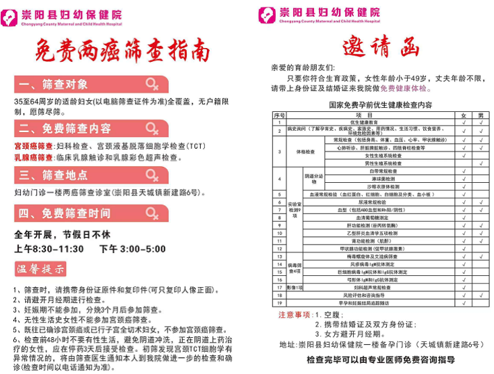 为切实保障广大妇女健康权益,提高出生人口素质,崇阳县妇幼保健院自11月17日起,面向全县居民(无户籍限制)持续推进两项重大妇幼民生项目——“两癌”免费筛查和国家免费孕前优生健康检查。
