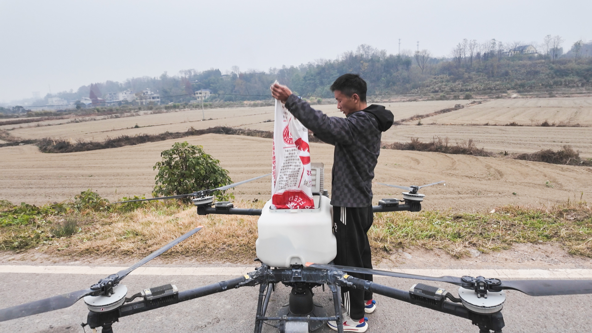与传统种植模式不同,合作社此次小麦播种全面采用无人机作业。只见操作人员熟练操控遥控器,无人机便按照预设航线平稳飞行,均匀地将麦种播撒在翻整好的田垄上。“以前人工播种80亩小麦需要10多个人干3天,现在用无人机1天就能完成,不仅省时省力,播种密度还更均匀,能有效提高出苗率。”甘德书介绍,科技赋能不仅让农业生产效率大幅提升,也大大降低了种植成本。
