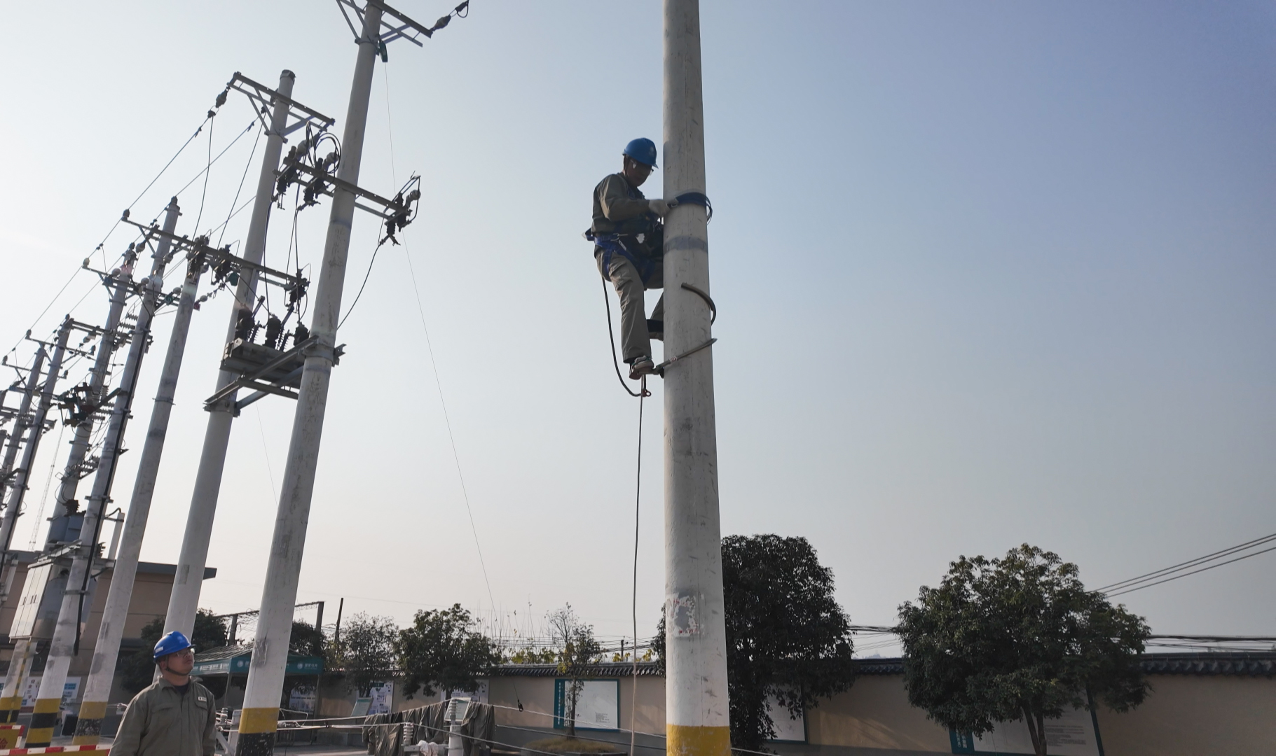 培训现场,电力工作人员身着专业作业服、系牢安全防护装备,攀爬电线杆,采用绝缘手套作业法开展0.4千伏线路带电接支线引线实操训练,地面工作人员同步密切配合,做好安全监护,整个作业流程规范有序。