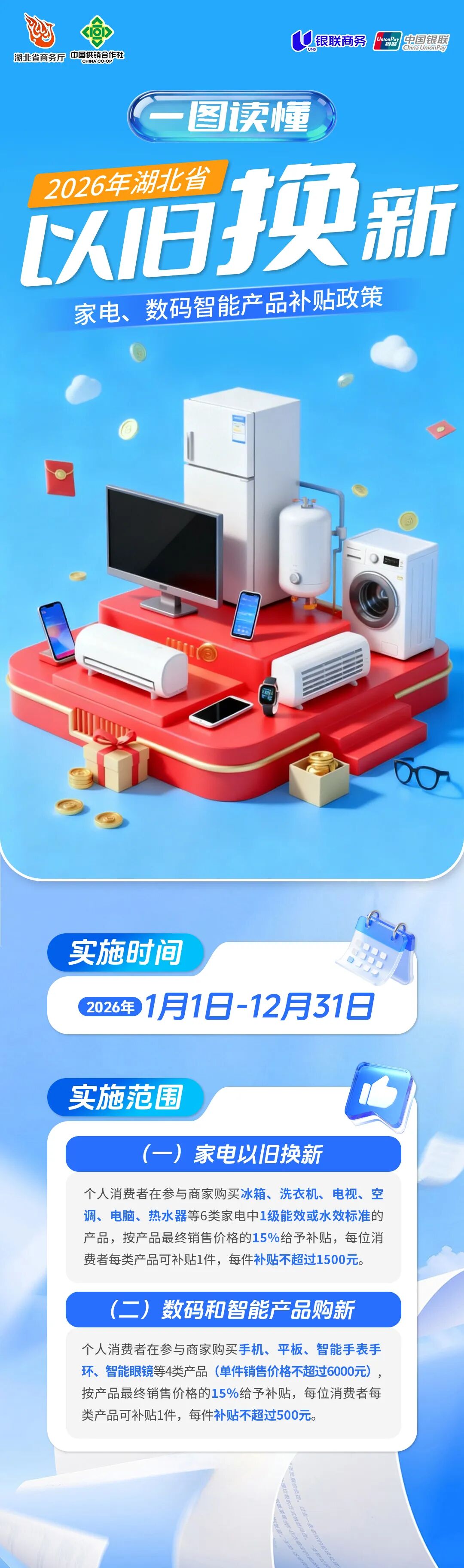 1月14日,“湖北以旧换新”微信公众号发文《一图读懂|2026年湖北省家电以旧换新、数码智能产品购新补贴政策》: