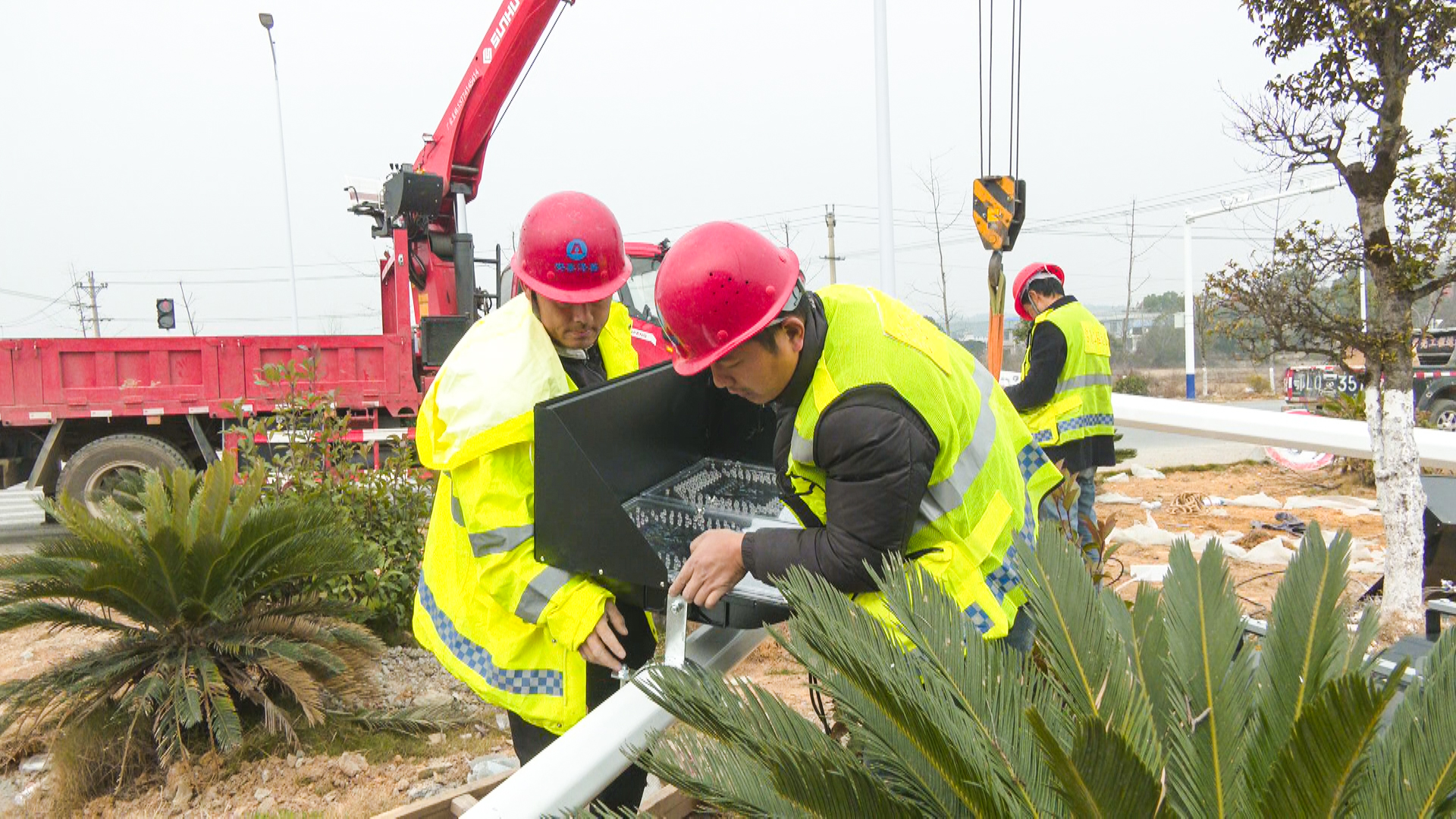 1月11日,石城镇石城社区十字路口施工正酣,工人们分工协作,精准完成交通指示灯灯杆定位、线路对接与设备校验等作业,现场秩序井然。