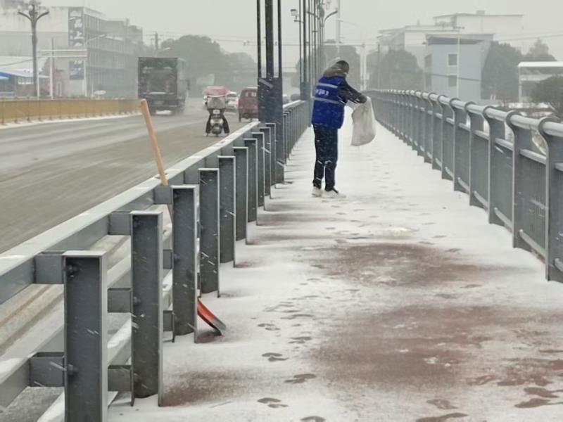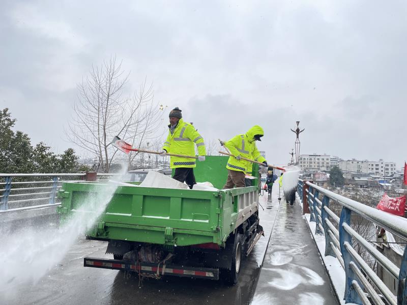1月19日晚,县环卫中心督促盛景环卫公司连夜清运生活垃圾100余吨,防止第二天因积雪严重导致清运垃圾困难。20日11时许,出动200余名环卫工人、30余台车辆在桥梁、天桥、医院、学校周边等重点区域预撒融雪剂近15吨,防止道路积雪结冰。城管执法队伍同步加强巡查,及时处置突发情况。