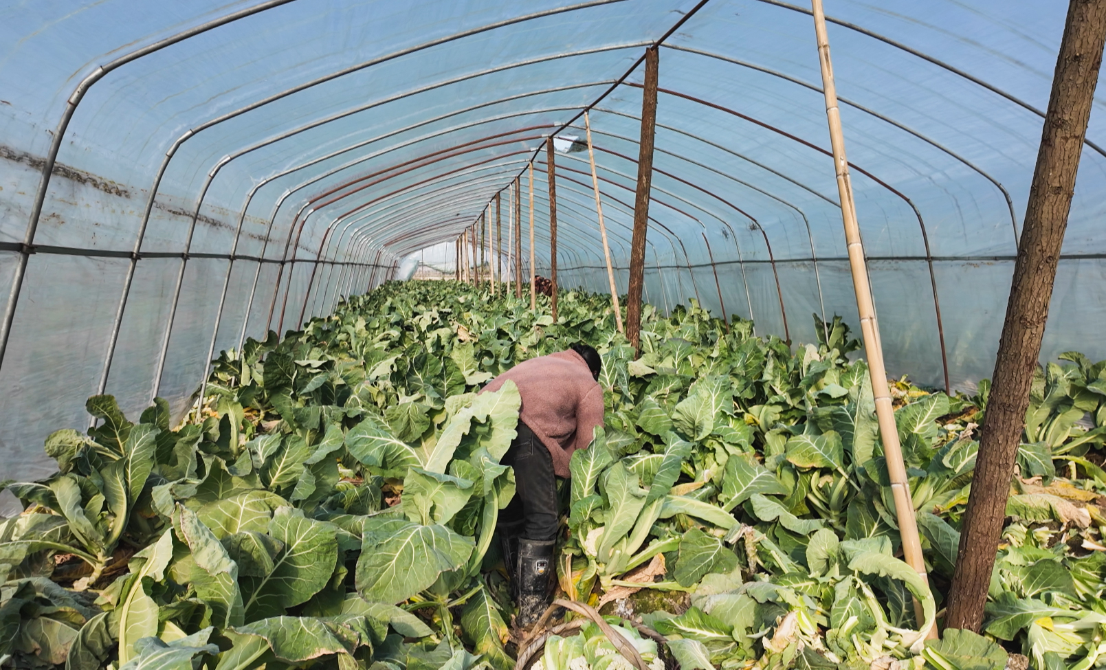 在基地连片的田垄旁,20余个花菜种植大棚同样生机盎然,肥厚的绿叶包裹着紧实的花球,负责人雷大姐告诉记者,这批花菜亩产量能达到2000斤左右,即将送往县城批发售卖。