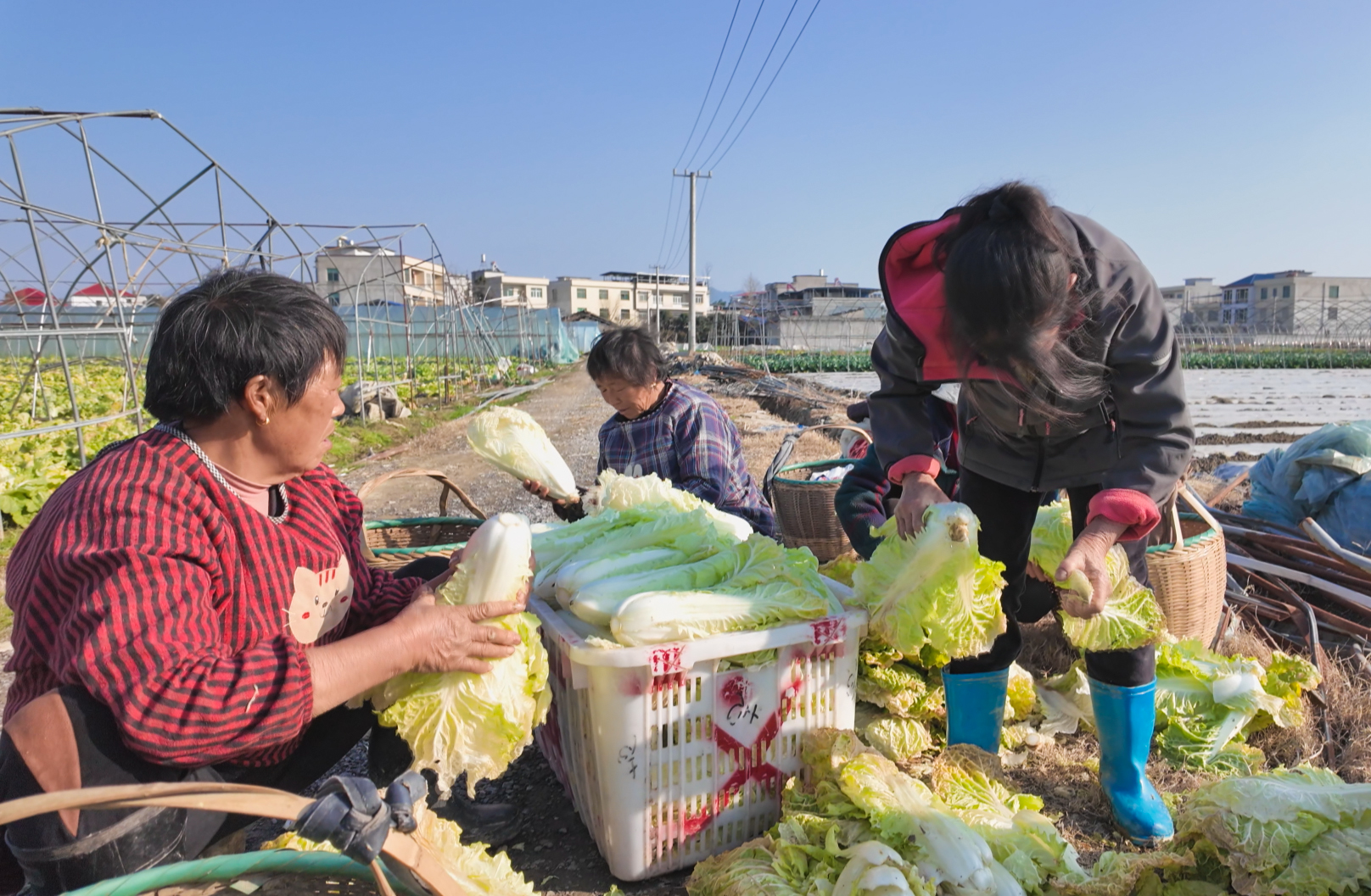 正在基地采收白菜的青山镇城万村村民吴天娥说:“我在家门口打工,每天能挣100元工钱,还能就近照顾家庭,我很开心。”