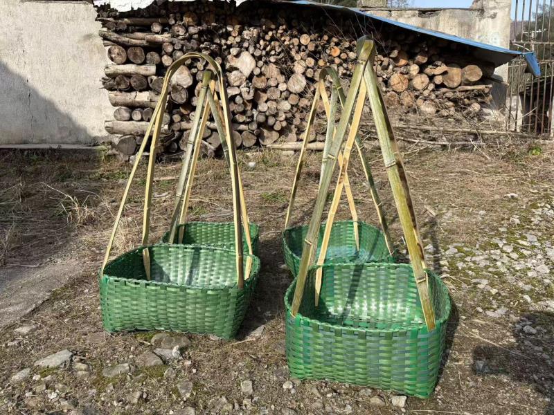 从砍竹、剖篾到编织成形,篾匠的十道工序,他们一道没省过。早年编谷箩、晒垫,后来编竹篮、果盘。后来,村里人买青竹不便,二老便改用绿色捆条。“材料不一样,编法还是老法子,经纬交错,横平竖直。”金九完说,“篮子轻了,但手劲没松,心里那根篾也还在。”