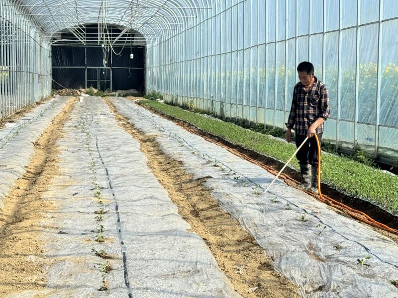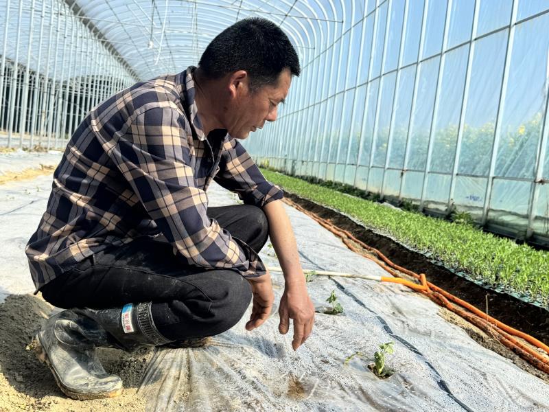 3月12日,走进育苗棚,一排排穴盘整齐排列,村民孙圆民正手持经过特殊处理的水管,小心翼翼地将斜切的管口直插进西瓜苗根部的土壤。“这样做是为了把水直接引到根底下,不淋湿叶子,还能省水。”孙圆民一边操作,一边熟练地沿着垄沟进行灌溉。