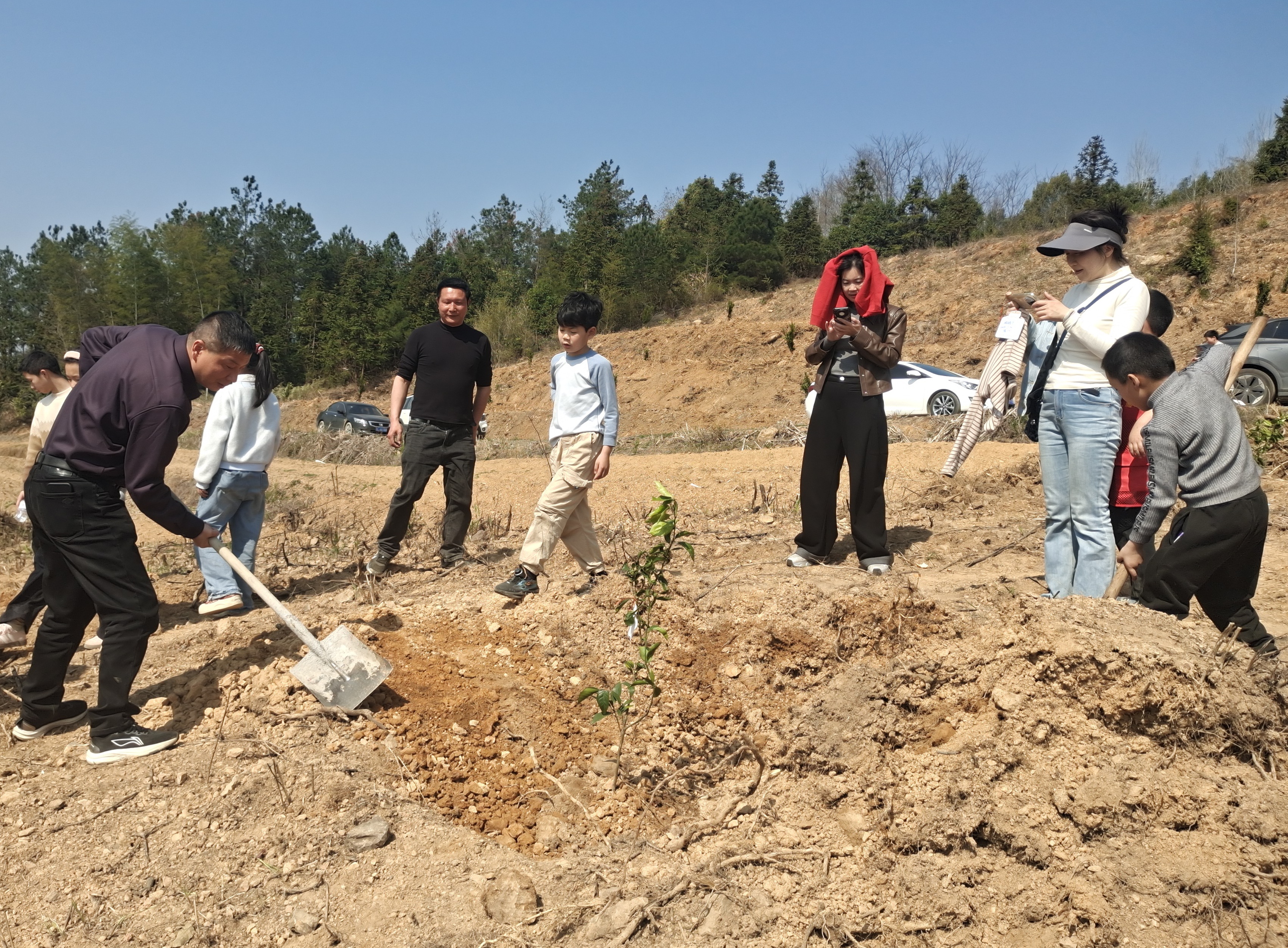 植树护绿活动现场,大家一起分工协作、默契配合,认真完成扶苗、填土、浇水等每一个步骤,亲手为家乡增添新绿。大家还为小树苗挂上认养牌,写下专属心愿卡,同步开展“护绿小使者”主题活动,引导孩子们树立尊重自然、爱绿护绿的良好意识,从小养成爱护生态环境的好习惯。