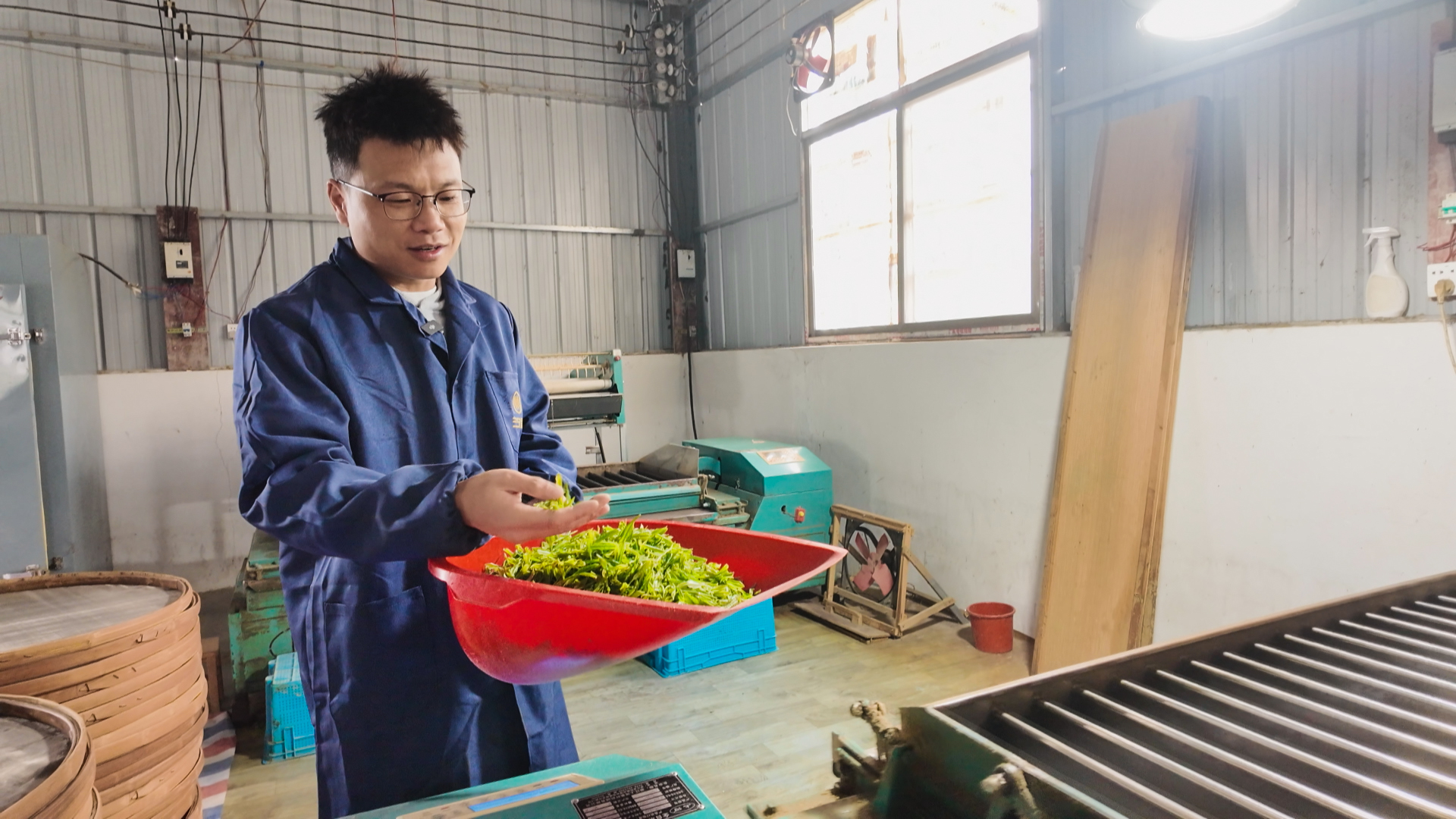 “每天的茶叶都不一样,炒茶的机器也要每天重新调试。比如今天的叶片稍微大一点,炒制的时间就要相应延长。”如今的毛海鹏,已通过自学熟练掌握了机械炒茶制茶的工艺,在机器轰鸣中,一锅锅沁人心脾的香茗接连出炉。