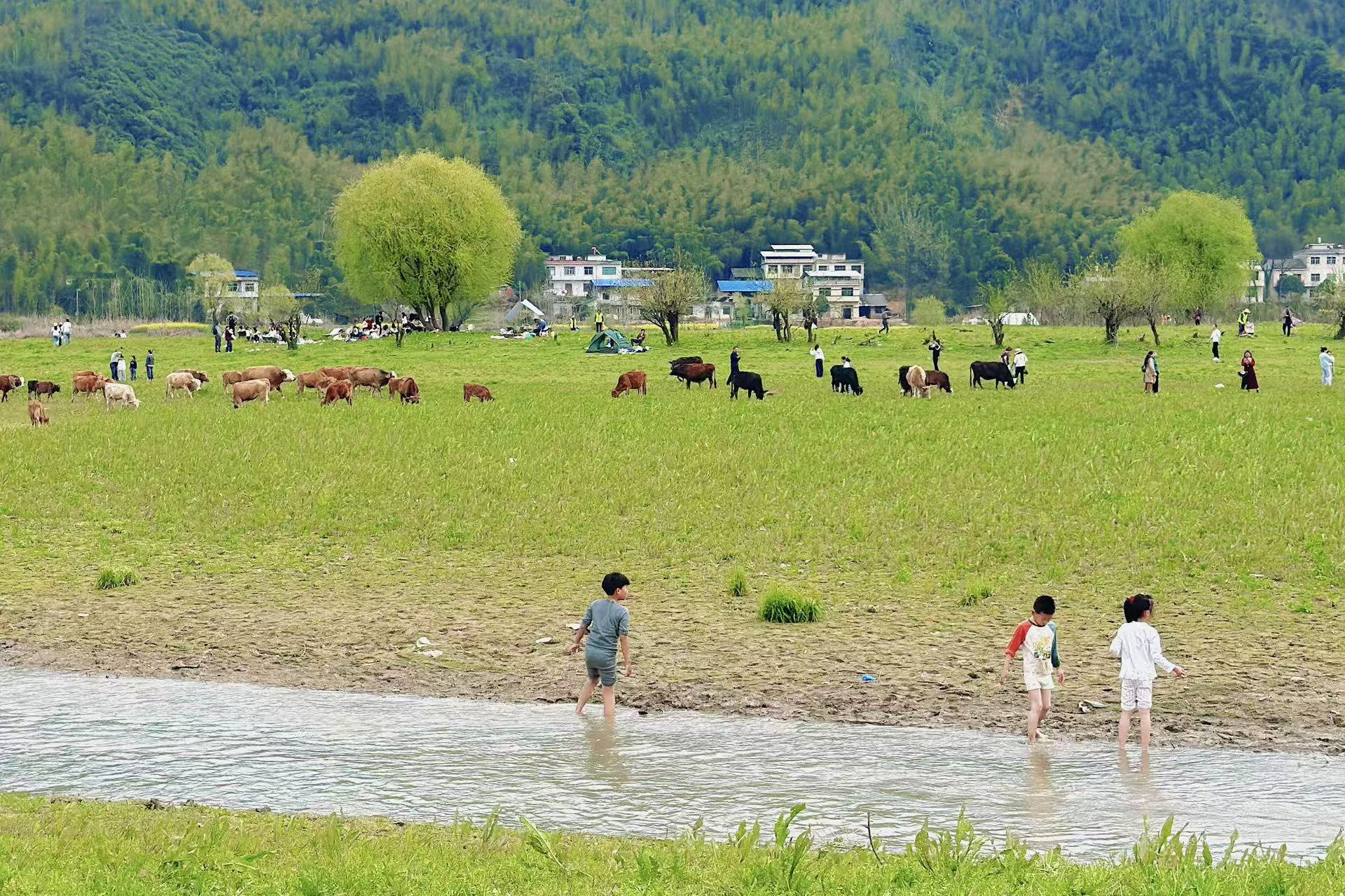在这片如画的美景中,几头黄牛漫步草地,不紧不慢地啃食春草,像闯入画中的客人,让静谧的景致添了几分温暖的烟火气。孩童在草地上无忧无虑地玩耍,游客们或露营烧烤,或闲坐岸边听流水淙淙,尽情享受大自然的馈赠。