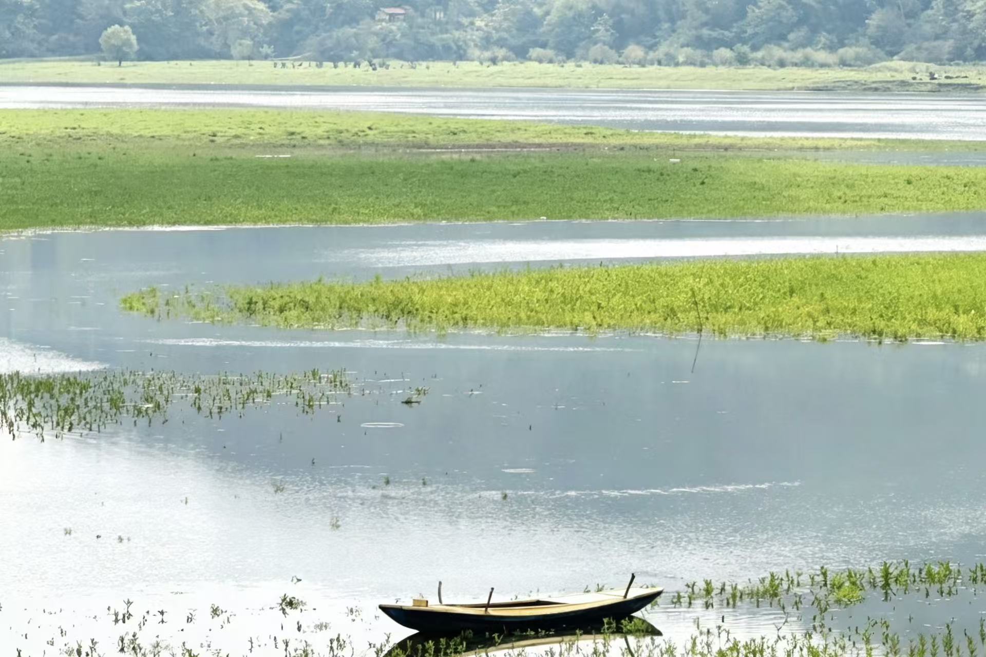 走进十里画廊,仿佛一头扎进了一幅刚刚落笔,还未干透的山水画里。杨柳抽芽吐绿,那湿润的、鲜嫩的绿意像刚从水里捞出来的丝线;水草丰茂,密密地铺满河岸,把泥土的气息都染成了青色。蜿蜒的河道如柔丝穿梭在茵茵草甸间,一叶小舟静泊水畔,与草甸勾勒出柔美的曲线。