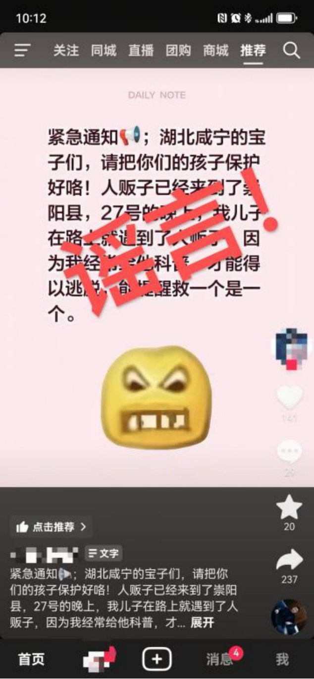 3月31日9时许,崇阳县公安局天城派出所民警在日常网络巡查中发现,有网民在某APP平台发布了一则内容为:“人贩子已经来到了崇阳县,27号的晚上,我儿子在路上就遇到了人贩子”的虚假视频。该视频发布后,迅速在网络上传播扩散,引发了部分辖区群众的恐慌情绪,造成了不良的社会影响。