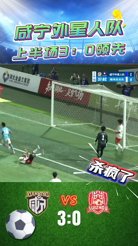 第37分钟,咸宁队再次打出精妙传切配合,10号前锋黎皓阳接队友传中,抢点攻门得手,再下一城扩大比分。上半场结束,咸宁外星人队带着3比0的优势进入中场休息。
