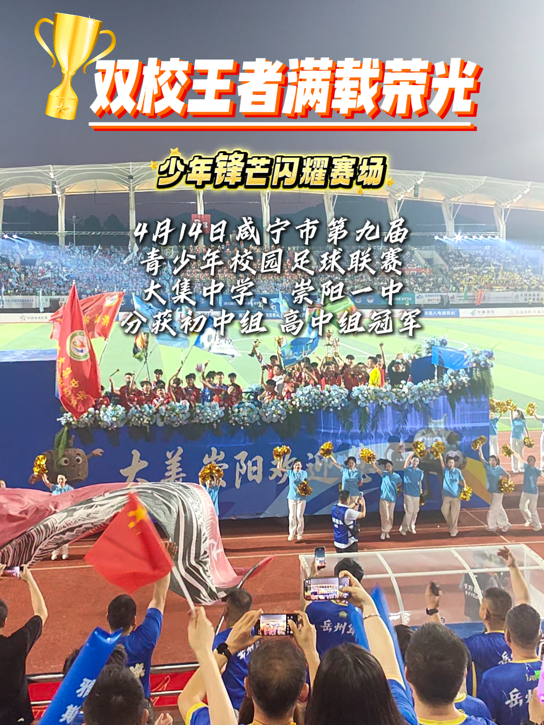 看台上,来自咸宁六个县市区的球迷方阵挥舞着各自的旗帜,猎猎飘扬的旗帜汇成一片蓝色海洋。与此同时,来自随州、岳阳、浏阳、九江等地的远征球迷也列阵欢呼,两侧看台呐喊声此起彼伏,将赛场氛围一次次推向高潮。