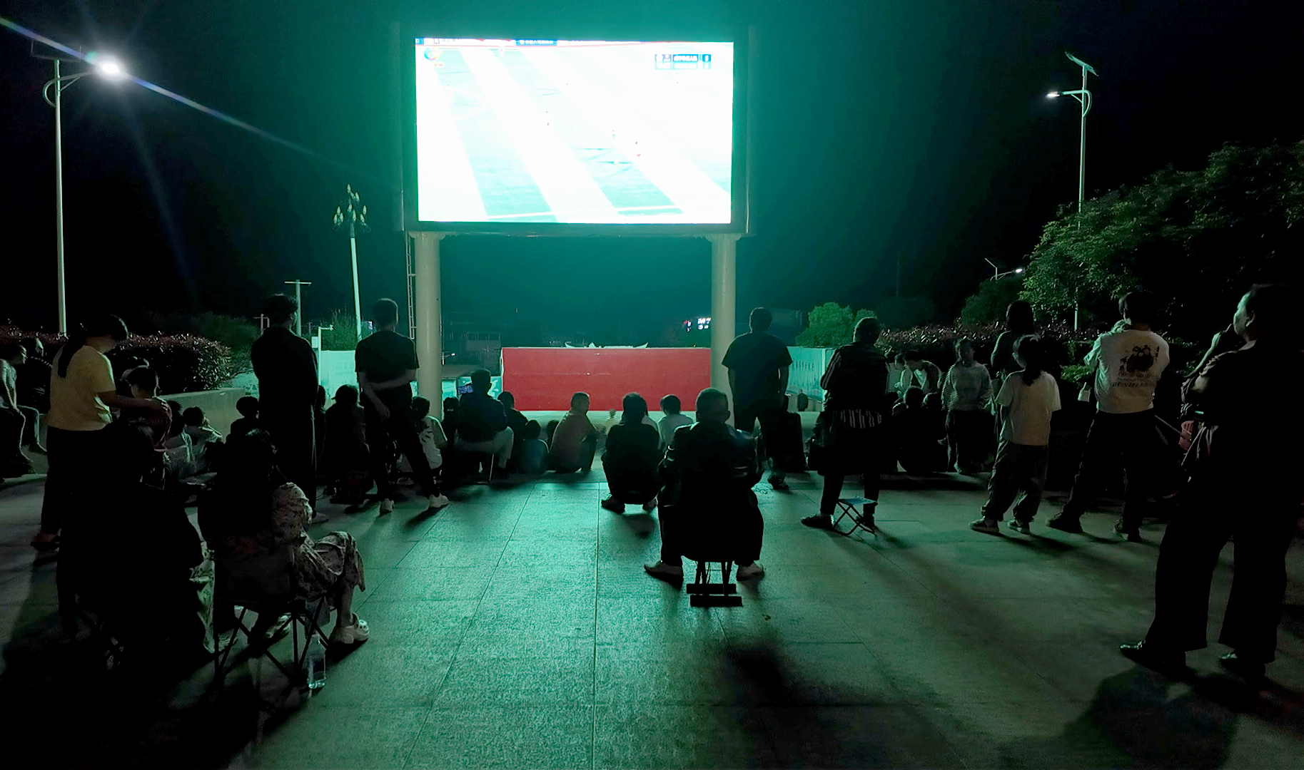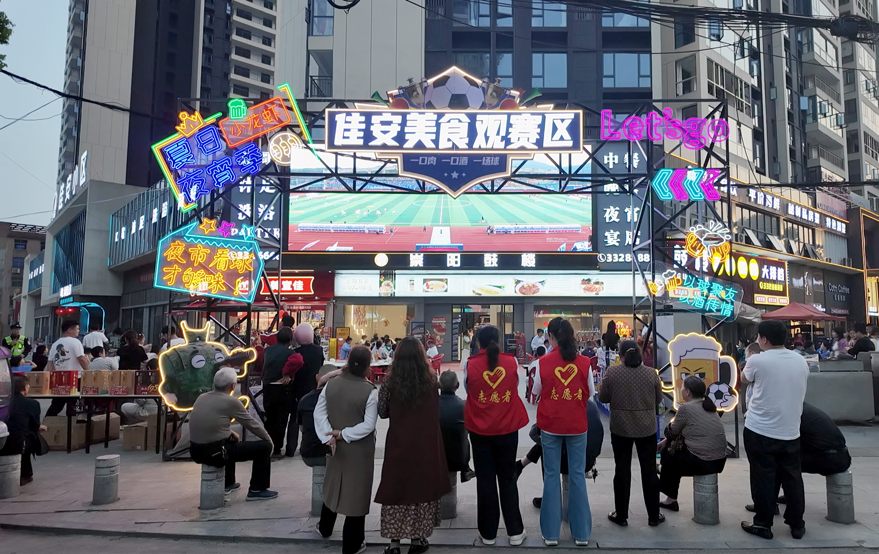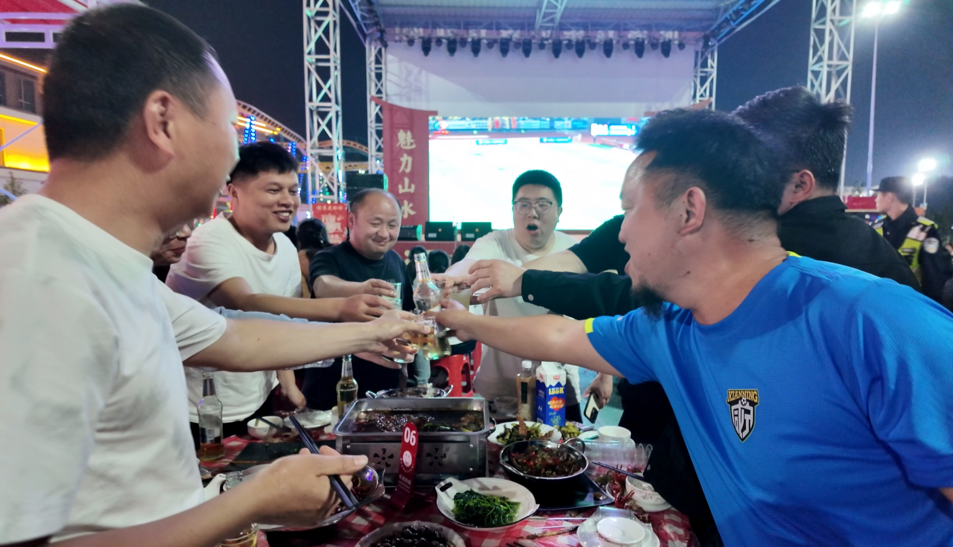 金泰广场上,中央大屏实时直播赛事进程,观赛区内座无虚席。摊位前食客络绎不绝,本地特色美食琳琅满目,市民们围坐一桌,一边品尝佳肴,一边紧盯赛场动态,“咸宁队加油”的口号声此起彼伏、响彻广场。佳安广场、大集广场、天城公园同样人声鼎沸,超大屏幕前挤满了观赛人群,欢呼声与助威声交相辉映,每一个角落都洋溢着热血与热忱。