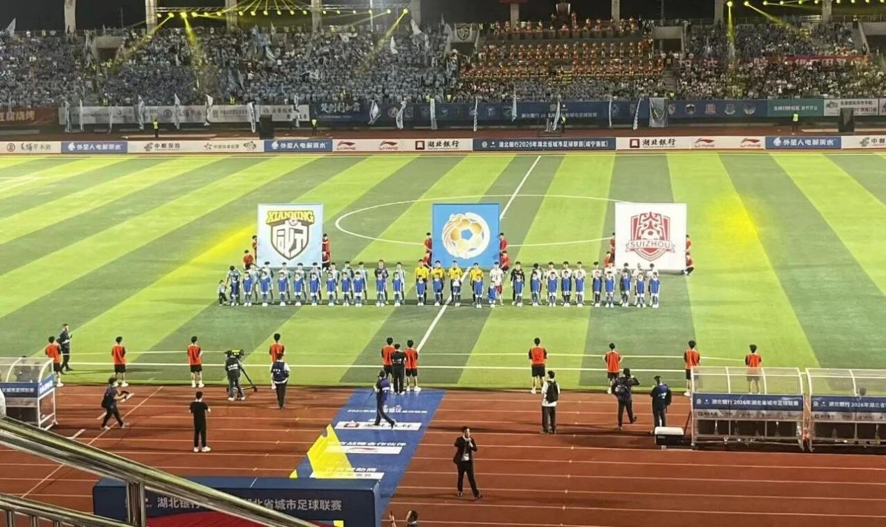 4月18日晚,崇阳县文体中心灯火璀璨、人声鼎沸。2026年湖北省城市足球联赛(“楚超”)咸宁赛区首场比赛火热开战。咸宁外星人队主场4:0完胜随州炎炎队,近万名球迷的呐喊声一浪高过一浪。