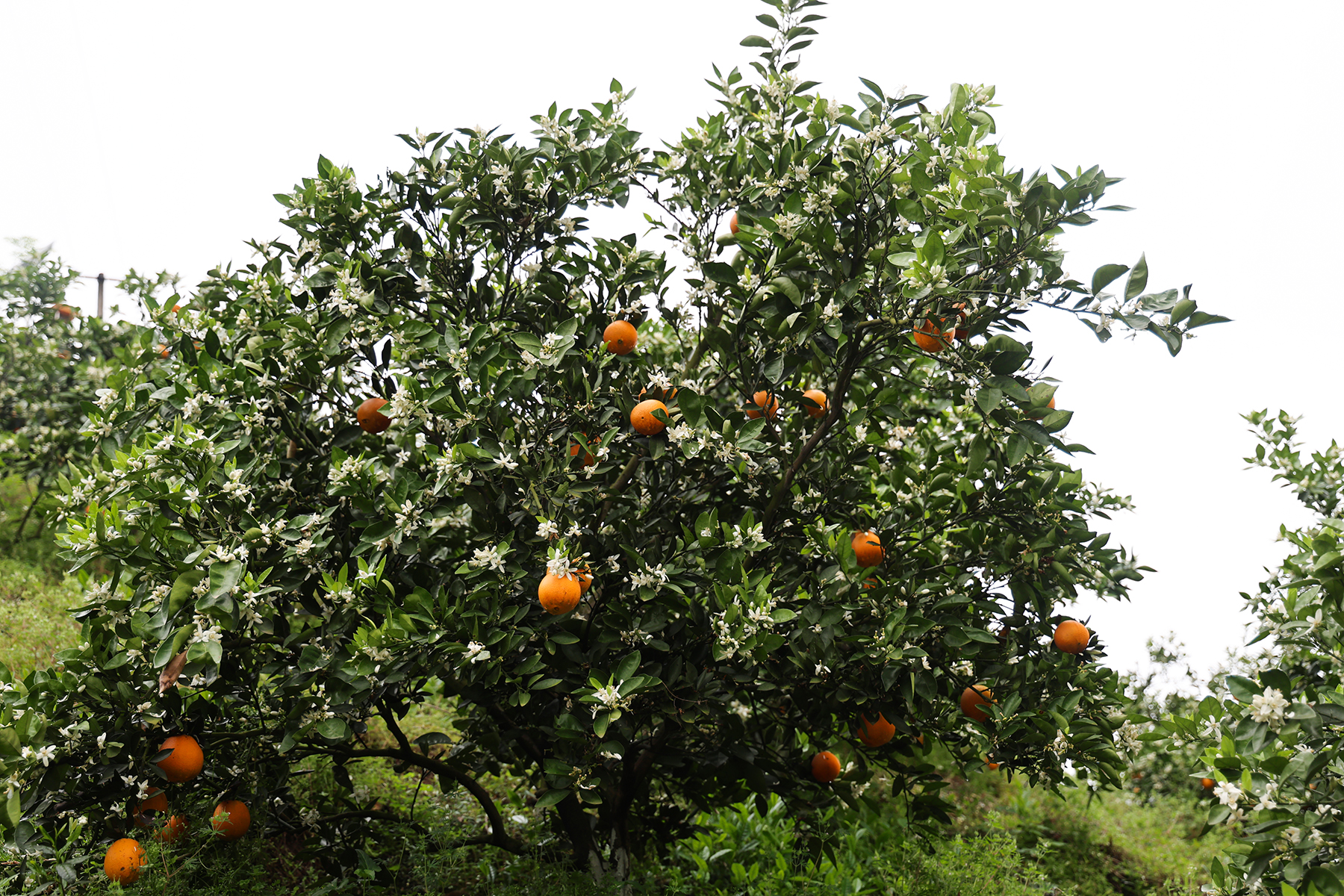 4月21日,记者走进基地,远远便能闻到橙树上的花香伴着果香,蜜蜂嗡嗡作响,黄澄澄的果实像一盏盏小灯笼挂满枝头,洁白的橙花引来蜂飞蝶舞,勾勒出一幅动人的春日画卷。基地独特的湿润气候、肥沃略带坡度的山地,搭配充足的阳光与湿润水汽,为炎明橙生长提供了绝佳环境,就连采摘本身,都是一场沉浸式的美景享受。
