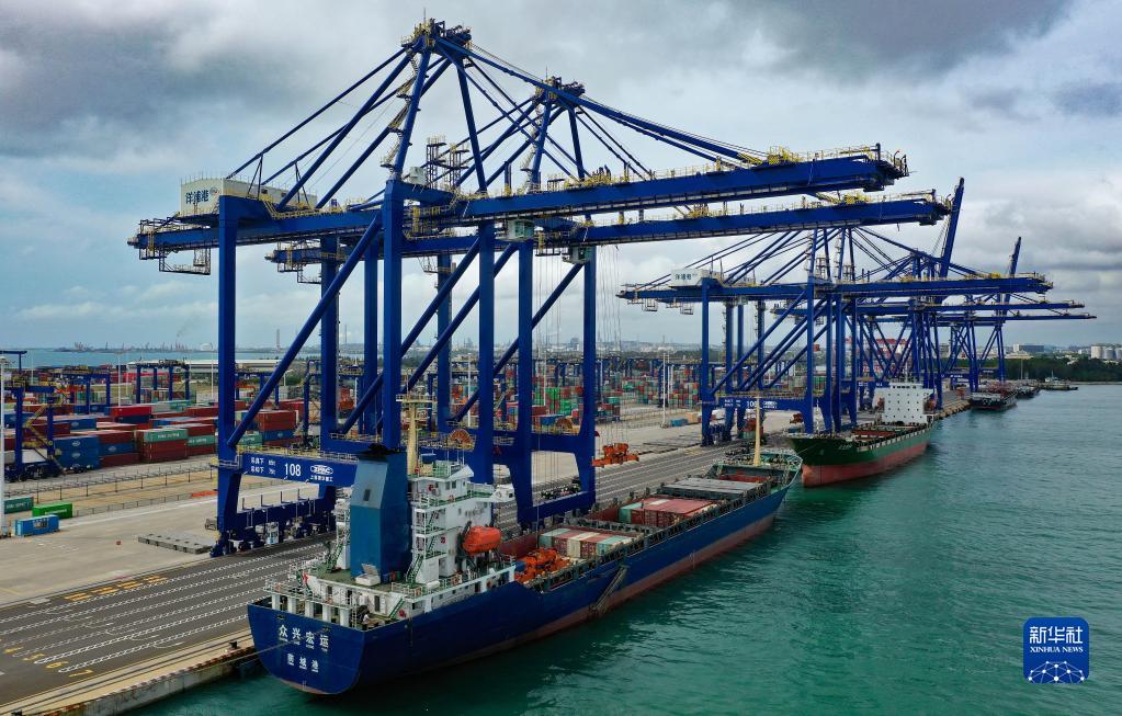 6月15日,集装箱货轮在海南洋浦国际集装箱码头装卸货物(无人机照片)。新华社记者 郭程 摄