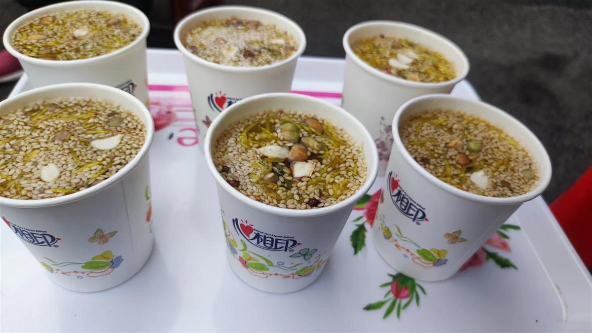 依次往杯子里拨入盐渍菊花瓣、茶叶、花椒,冲入开水,稍后再加芝麻、花生炒豆子……一杯杯香味四溢的菊花豆子茶就被放上小凳,晚风吹凉一点后,大家各自捧上。“菊花豆子茶,在崇阳金塘、高枧等地是用来招待贵客的,在我们小区,邻里就是彼此的贵客,所以天天有得喝。”沈意乐在其中。