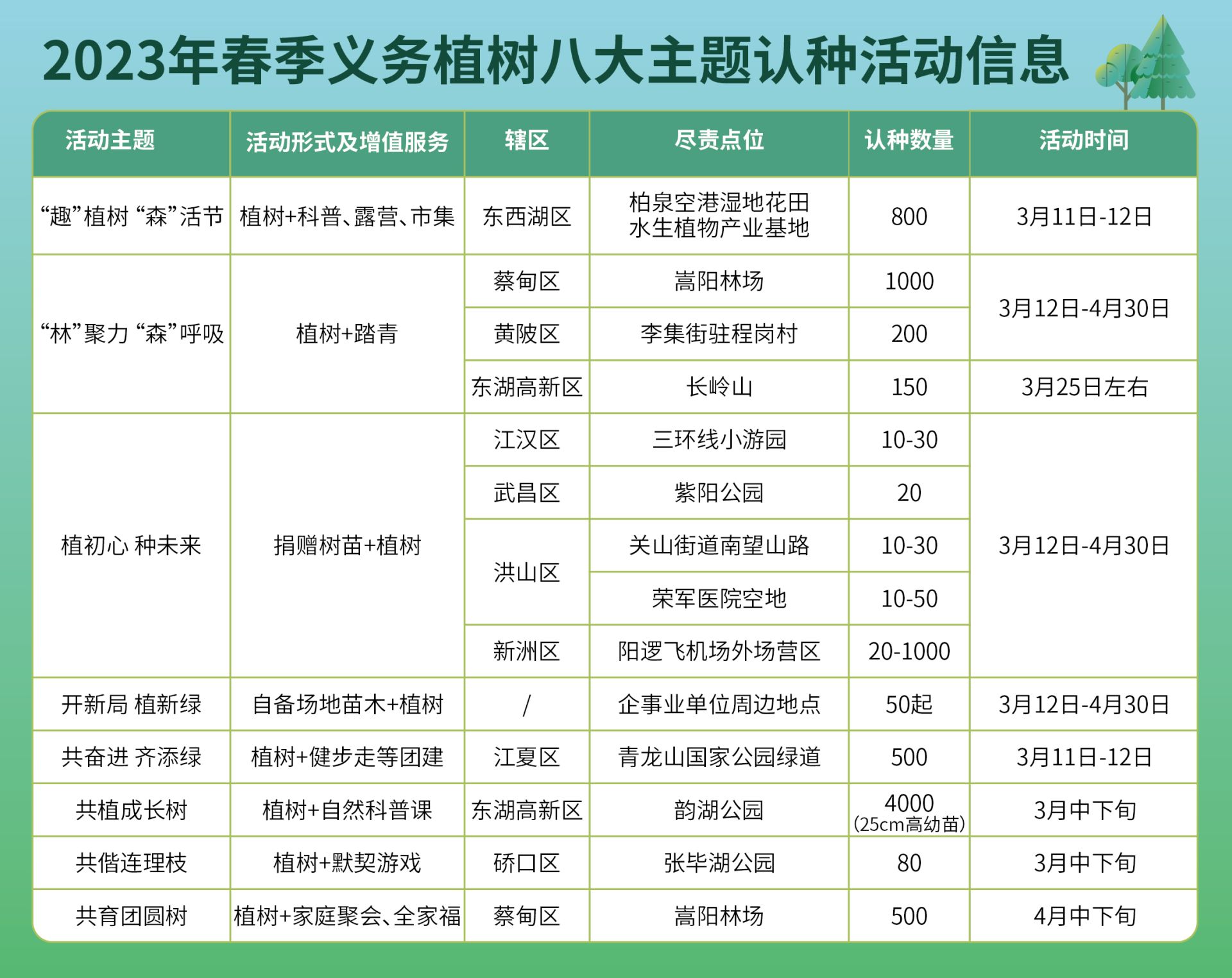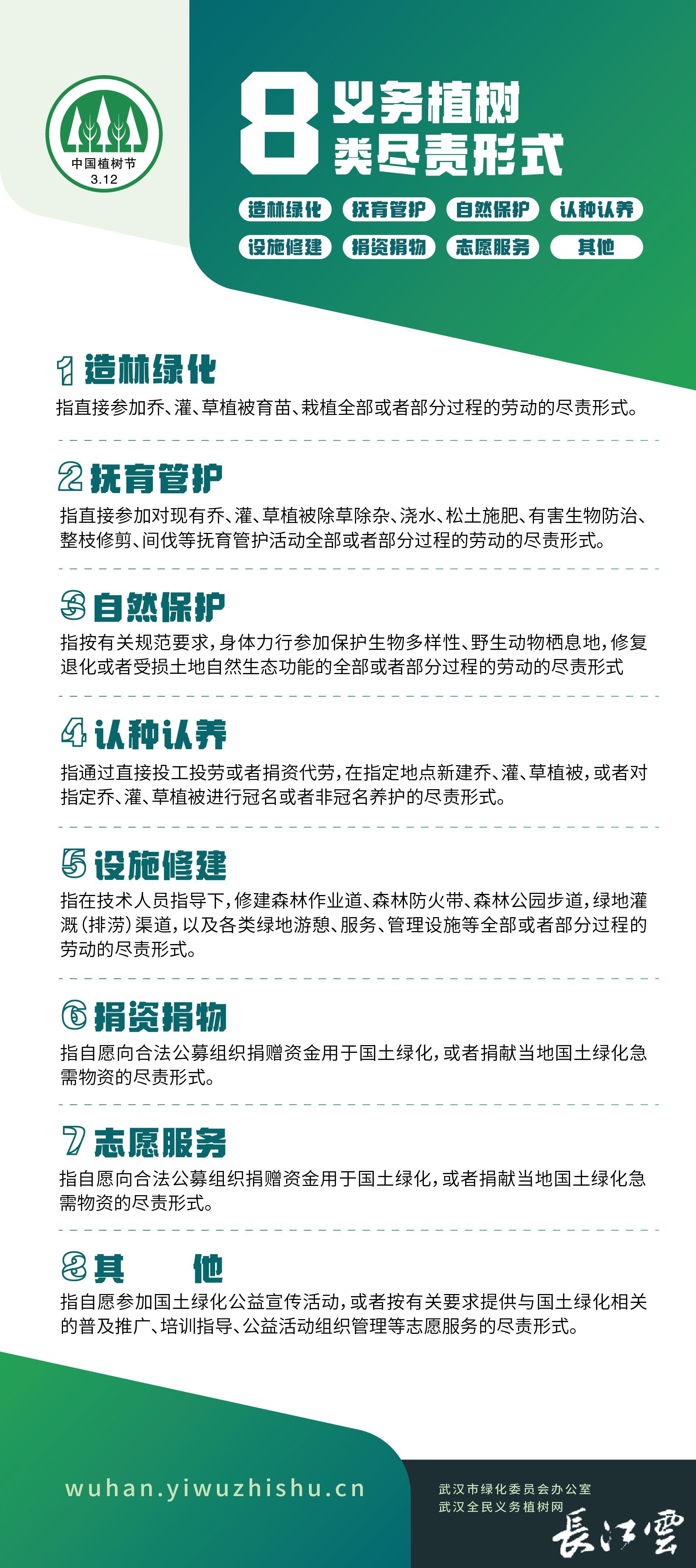 据武汉市绿化委员会办公室负责人介绍,今年3月12日是第44个植树节,武汉市积极响应全国绿化委员会办公室倡导的八类义务植树尽责形式,为满足社会各界植绿热情,尤其是一些企事业单位和市民家庭的个性化需求,带动更广泛的参与,推出以“绿动武汉”为主题的系列植树活动。全市共设置17个植树点和24个认养点,开展植树认养、主题认种两大类活动。