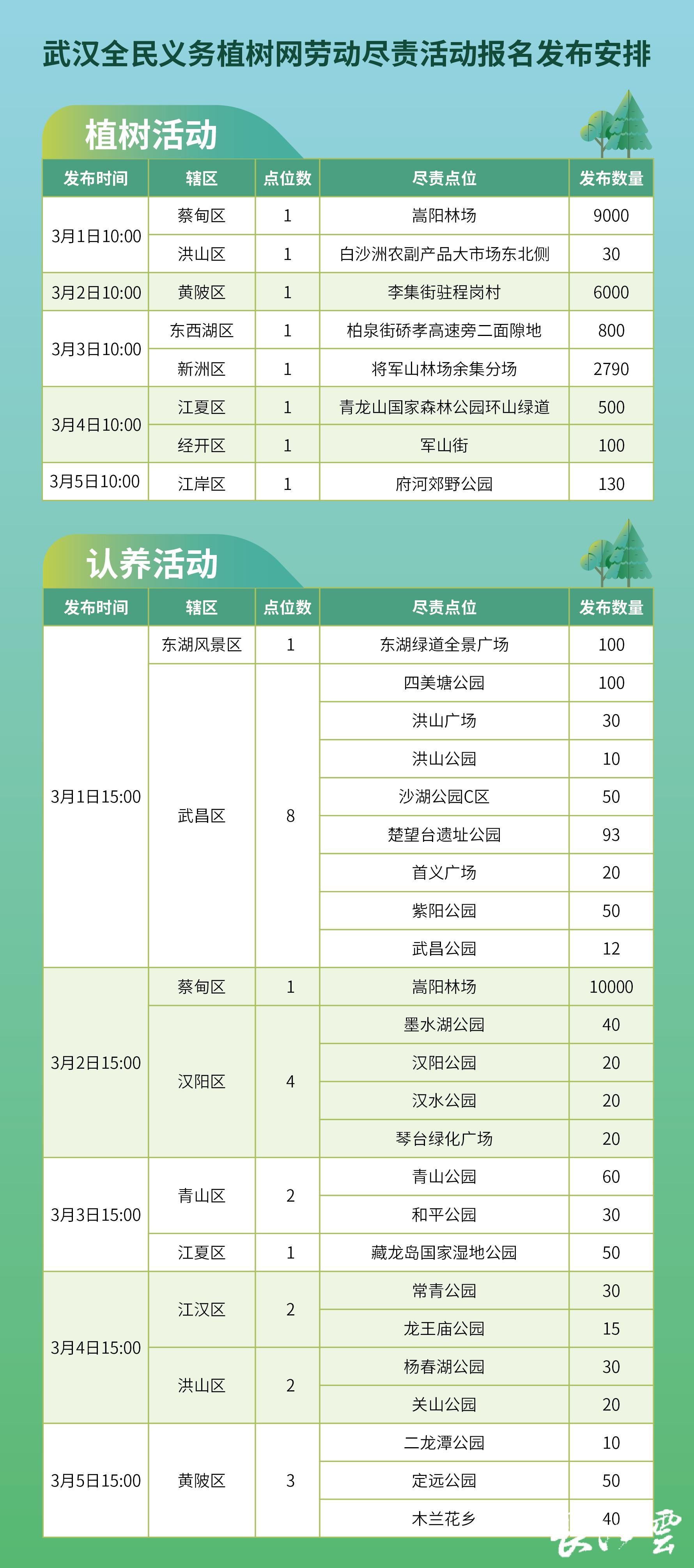 植树认养活动将于3月1日-3月5日分批次开通线上报名通道,每天上午10:00发布一次植树活动信息、下午15:00发布一次认养活动信息。个人、团队均可登录“武汉全民义务植树”网站或微信公众号,预定活动名额,每场活动个人可预订1棵树苗,团队可预订3棵树苗。活动预订成功后,报名者凭订单信息,按时到预订地点参与活动,未按时参与者视同放弃。