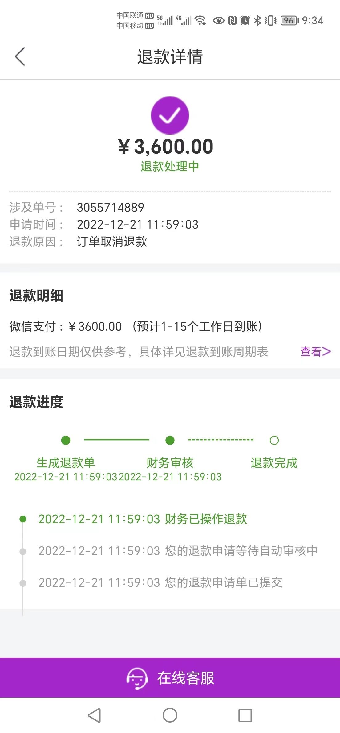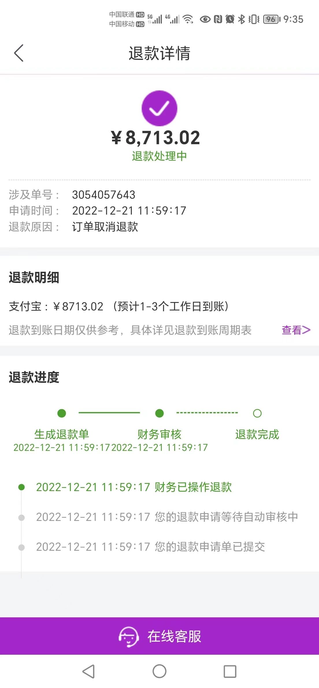 2022年12月21日,刘先生在国美电器App上申请退款,很快便通过了审核,流程显示“财务已操作退款”。