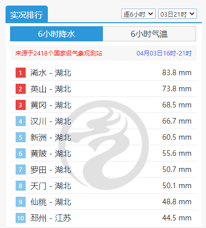 据中央气象台,在过去的6小时里(4月3日16时到21时),湖北承包了全国降水的前9名。湖北发布多条暴雨雷电冰雹预警,4月3日白天到夜间湖北东部有较强降水,短时强降水导致街道出现不同程度的积水,出行需谨慎。
