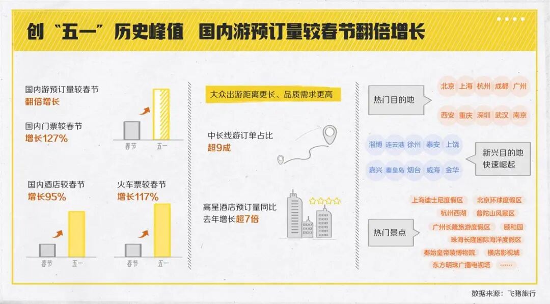 飞猪平台大数据显示,五一国内门票较春节增长127%,酒店和火车票分别增长95%和117%,创下五一假期历史峰值。北京、上海、杭州、成都、广州、西安、重庆、深圳、武汉、南京等是“五一”最热门目的地。