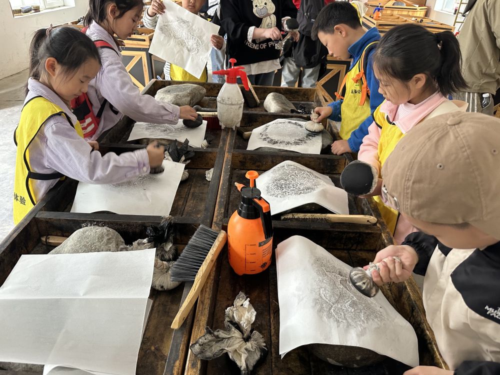 宁夏贺兰山岩画遗址公园,小朋友们体验制作岩画拓片。新华社记者 马丽娟 摄