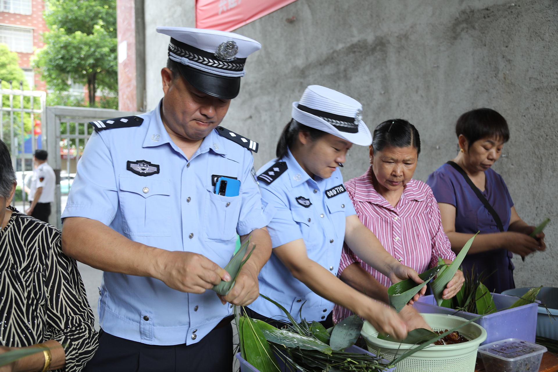 民辅警们与社区居民及志愿者一起包粽子,一边体会传统技艺的魅力,一边巧用粽子向大家讲解交通安全知识。“粽不包叶、不成型,人不戴盔、有危险,以头盔为叶、包裹安全;粽不裹馅、空空如也,以交规为馅、牢记平安;粽不系绳、一碰就散,人不系带、一碰就伤,以安全带为绳,保护生命”,民辅警们在包粽子送祝福的同时,通过形象生动的比喻宣讲“一盔一带”的重要性,以寓教于乐的方式向群众宣传交规知识,提升交通安全意识。在包粽子的过程中,大家互相交流包粽子的方法和心得,在相互学习中共话端午习俗,感受浓浓的节日氛围。